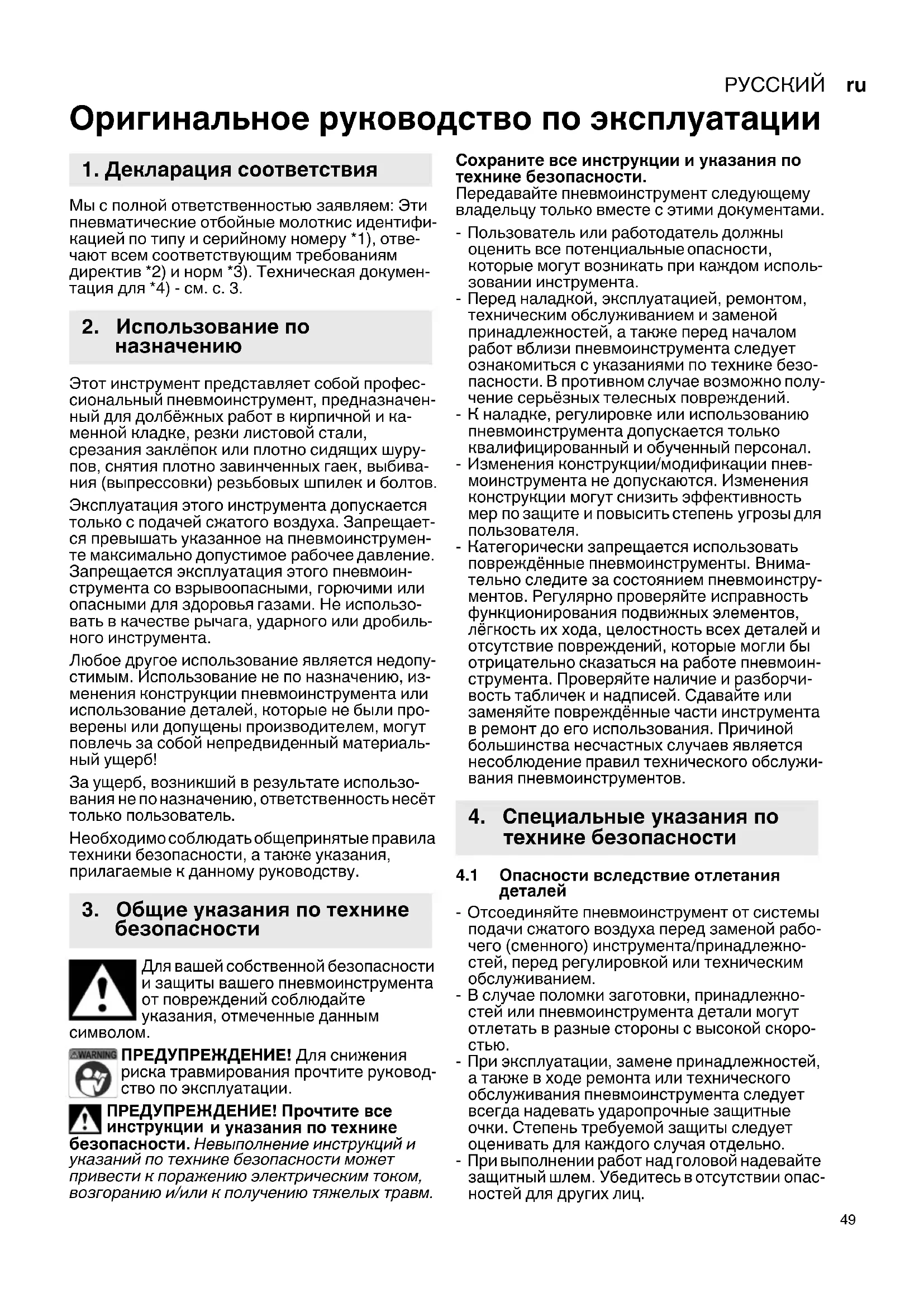 Оригинальное руководство по эксплуатации Мы с полной ответственностью заявляем: Эти пневматические отбойные молоткис идентифи- кацией по типу и серийному номеру *1), отве- чают всем соответствующим требованиям директив *2) и норм *3). Техническая докумен- тация для *4) - см. с. 3. Этот инструмент представляет собой профес- сиональный пневмоинструмент, предназначен- ный для долбёжных работ в кирпичной и ка- менной кладке, резки листовой стали
