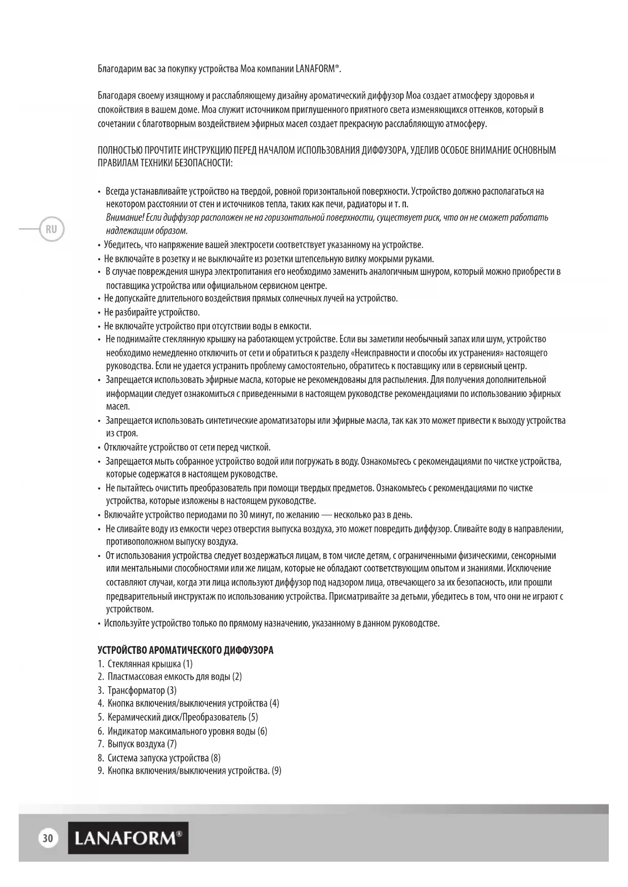- Компания Lanaform® снимает с себя ответственность за ущерб, понесенный в результате использования устройства с нарушением требований, приведенных в настоящем руководстве по эксплуатации. УХОД И ХРАНЕНИЕ При повышенном содержании кальция и магния в воде на стенках устройства может образоваться белый налет (накипь). Если такая накипь появляется на преобразователе (преобразователях) (керамическая белая пластинка, которая генерирует ультразвук, рис. 1, пункт 5), устройство не может функционировать нормально. Рекомендации по уходу: Мы рекомендуем: