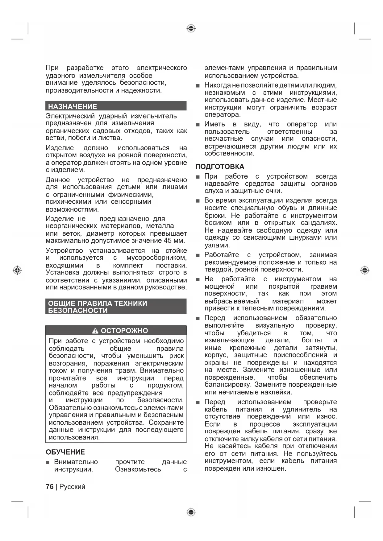 При подаче в устройство длинных деревянных веток/стеблей остерегайтесь рывков и вибраций, возникающих при захвате материала режущим приспособлением. Оператор должен носить средство защиты глаз во время эксплуатации изделия.82 | Русский
