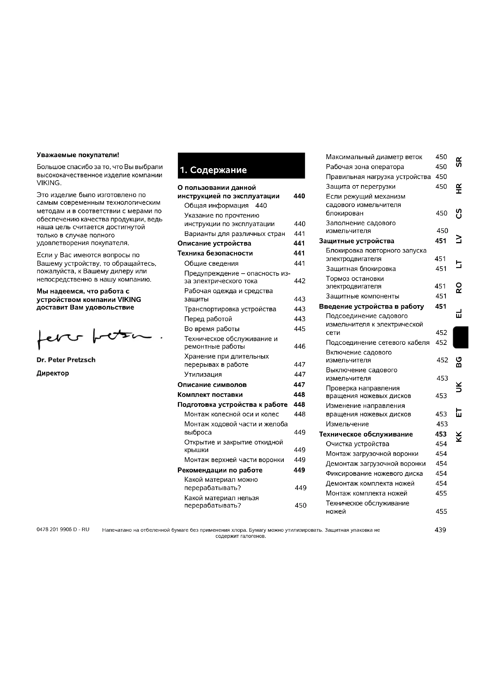 О пользовании данной инструкцией по эксплуатации 440 Общая информация 440 Указание по прочтению инструкции по эксплуатации 440 Варианты для различных стран 441 Описание устройства 441 Техника безопасности 441 Общие сведения 441 Предупреждение – опасность из- за электрического тока 442 Рабочая одежда и средства защиты 443 Транспортировка устройства 443 Перед работой 443 Во время работы 445 Техническое обслуживание и ремонтные работы 446 Хранение при длительных перерывах в работе 447 Утилизация 447 Описание символов 447 Комплект поставки 448 Подготовка устройства к работе 448 Монтаж колесной оси и колес 448 Монтаж ходовой части и желоба выброса 449 Открытие и закрытие откидной крышки 449 Монтаж верхней части воронки 449 Рекомендации по работе 449 Какой материал можно перерабатывать?449 Какой материал нельзя перерабатывать?450 Максимальный диаметр веток 450 Рабочая зона оператора 450 Правильная нагрузка устройства 450 Защита от перегрузки 450 Если режущий механизм садового измельчителя блокирован 450 Заполнение садового измельчителя 450 Защитные устройства 451 Блокировка повторного запуска электродвигателя 451 Защитная блокировка 451 Тормоз остановки электродвигателя 451 Защитные компоненты 451 Введение устройства в работу 451 Подсоединение садового измельчителя к электрической сети 452 Подсоединение сетевого кабеля 452 Включение садового измельчителя 452 Выключение садового измельчителя 453 Проверка направления вращения ножевых дисков 453 Изменение направления вращения ножевых дисков 453 Измельчение 453 Техническое обслуживание 453 Очистка устройства 454 Монтаж загрузочной воронки 454 Демонтаж загрузочной воронки 454 Фиксирование ножевого диска 454 Демонтаж комплекта ножей 454 Монтаж комплекта ножей 455 Техническое обслуживание ножей 4550478 201 9906 D - RU