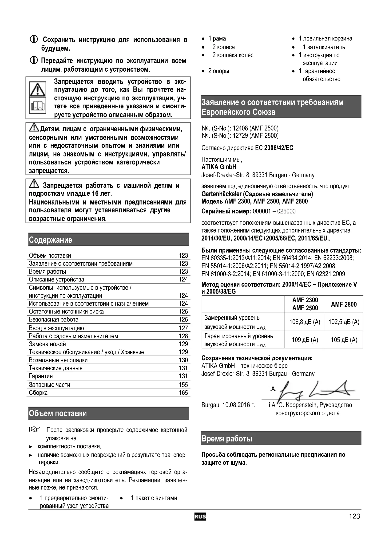 заявляем под единоличную ответственность, что продукт Gartenhäcksler (Cадовые измельчители) Модель AMF 2300, AMF 2500, AMF 2800 Серийный номер: 000001 – 025000 соответствует положениям вышеназванных директив ЕС, а также положениям следующих дополнительных директив: 2014/30/EU, 2000/14/EC+2005/88/EC, 2011/65/EU..