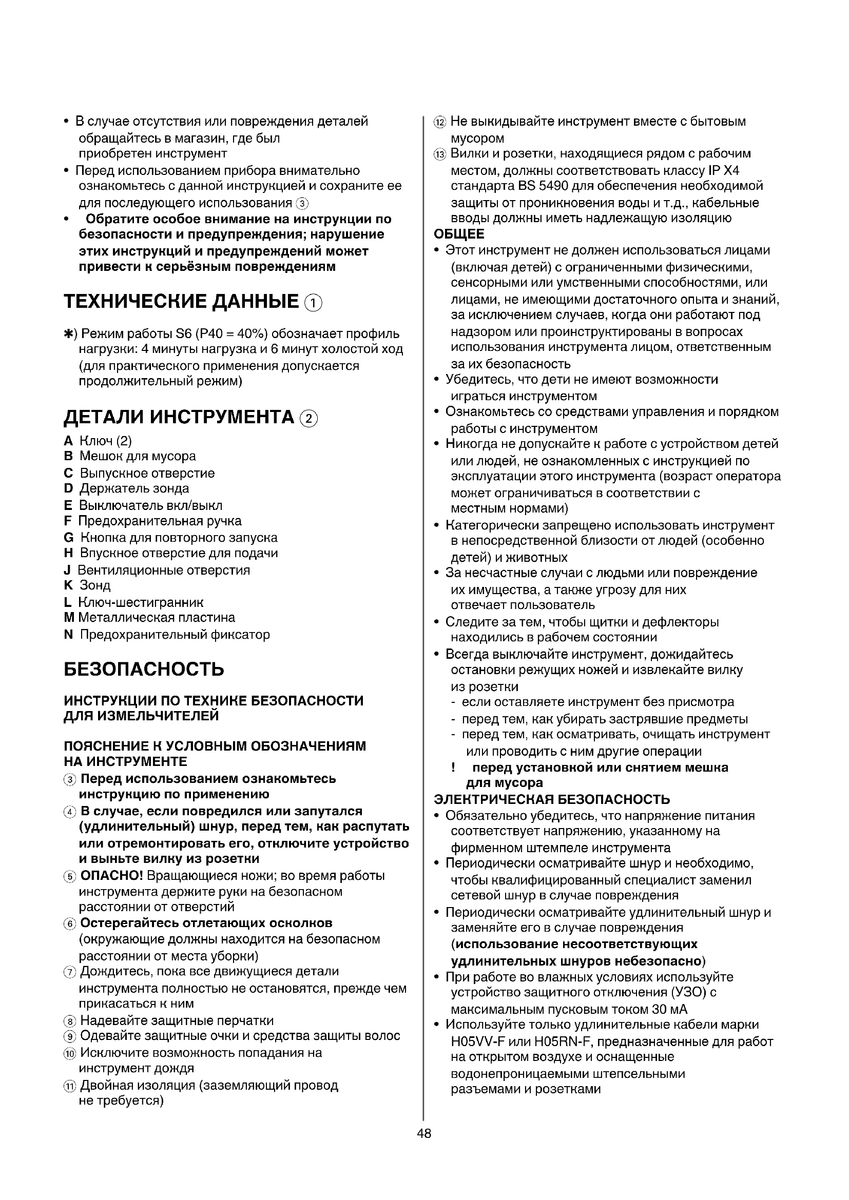⑤ ОПАСНО! Вращающиеся ножи; во время работы инструмента держите руки на безопасном расстоянии от отверстий
