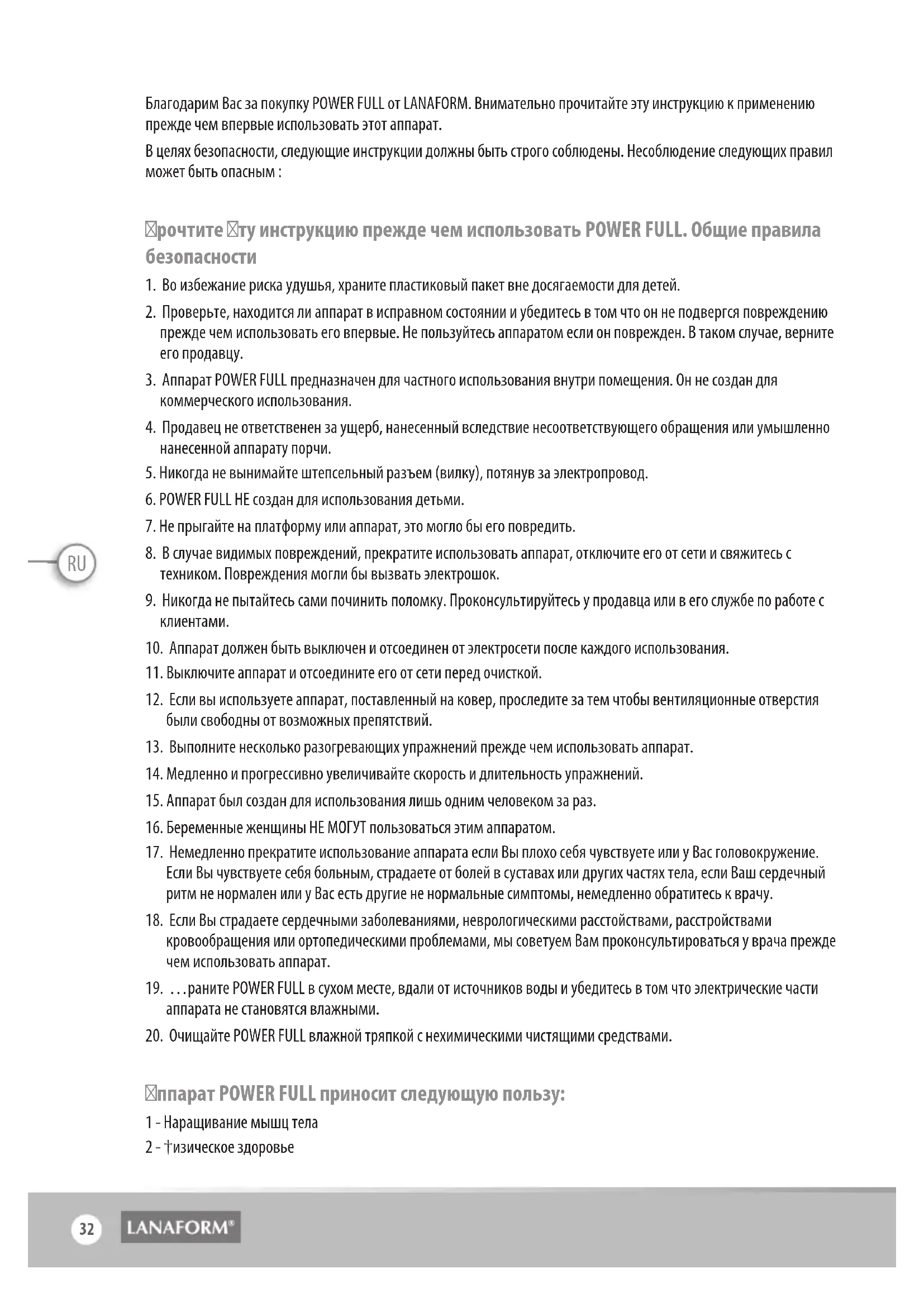 Power Full 31RU Благодарим Вас за покупку POWER FULL от LANAFORM. Внимательно прочитайте эту инструкцию к применению прежде чем впервые использовать этот аппарат. В целях безопасности, следующие инструкции должны быть строго соблюдены. Несоблюдение следующих правил может быть опасным : рочтите ту инструкцию прежде чем использовать POWER FULL. Общие правила безопасности