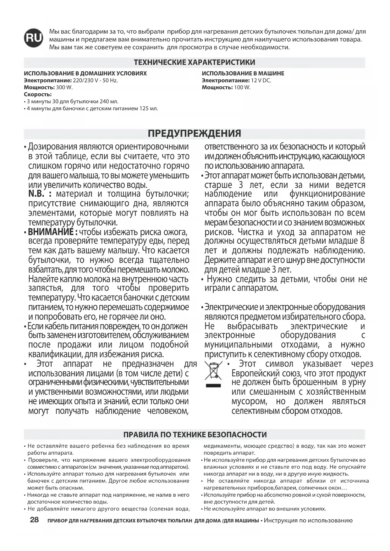 - Этот символ указывает через Европейский союз, что этот продукт не должен быть брошенным в урну или смешанным с хозяйственным мусором, но должен являться селективным сбором отходов. ИСПОЛЬЗОВАНИЕ В ДОМАШНИХ УСЛОВИЯХЭлектропитание: 220/230 V - 50 Hz.Мощность: 300 W.Скорость:• 3 минуты 30 для бутылочки 240 мл.• 4 минуты для баночки с детским питанием 125 мл.ИСПОЛЬЗОВАНИЕ В МАШИНЕЭлектропитание: 12 V DC.Мощность: 100 W. ТЕХНИЧЕСКИЕ ХАРАКТЕРИСТИКИ• Всегда используйте корзину для нагревания бутылочек и баночек с детским питанием для избежания повреждения аппарата.