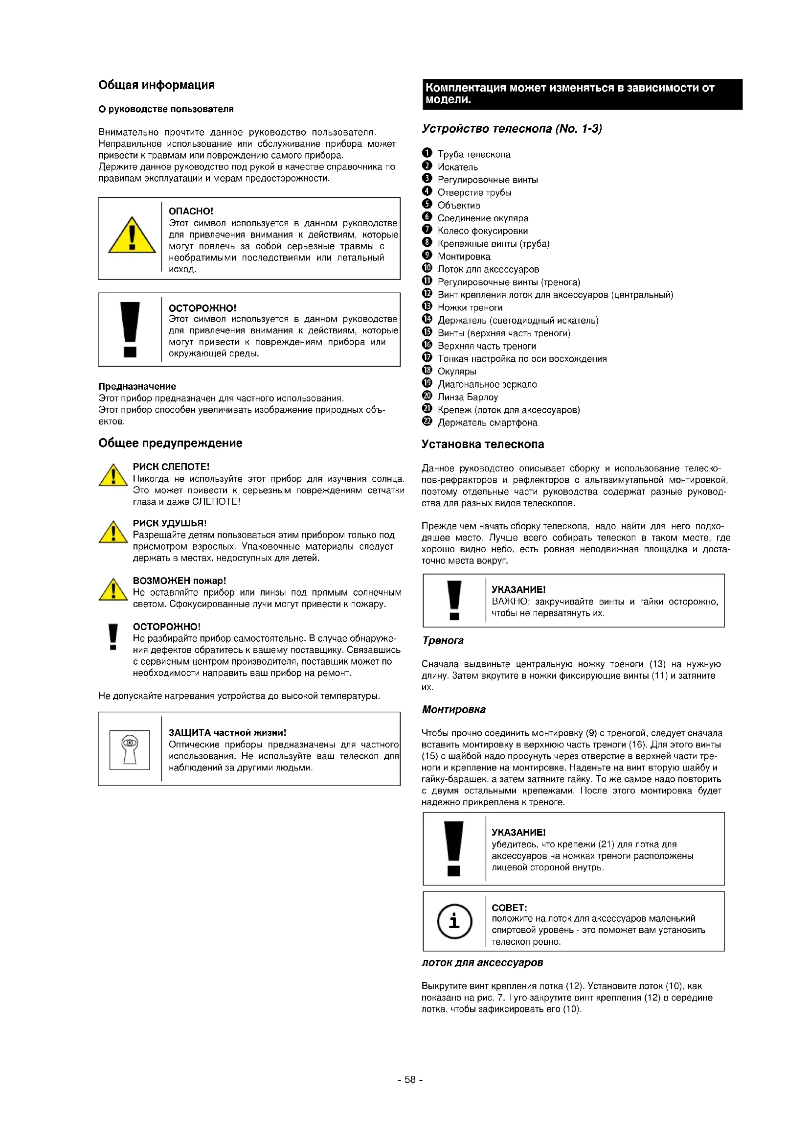 Не разбирайте прибор самостоятельно. В случае обнаруже- ния дефектов обратитесь к вашему поставщику. Связавшись с сервисным центром производителя, поставщик может по необходимости направить ваш прибор на ремонт. Не допускайте нагревания устройства до высокой температуры. ЗАЩИТА частной жизни! Оптические приборы предназначены для частного использования. Не используйте ваш телескоп для наблюдений за другими людьми. Комплектация может изменяться в зависимости от