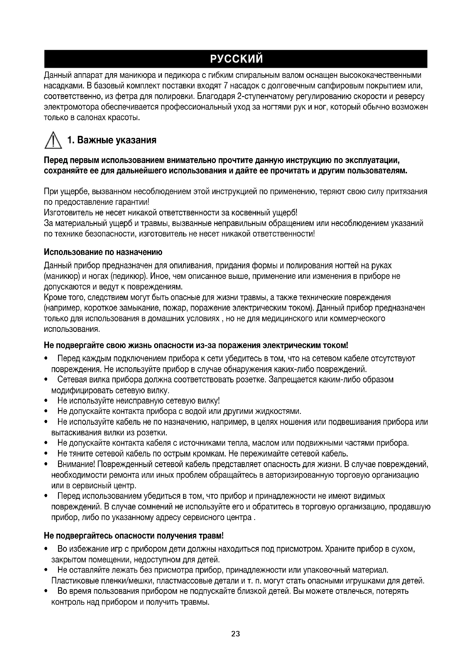 Перед первым использованием внимательно прочтите данную инструкцию по эксплуатации, сохраняйте ее для дальнейшего использования и дайте ее прочитать и другим пользователям. При ущербе, вызванном несоблюдением этой инструкцией по применению, теряют свою силу притязания по предоставление гарантии! Изготовитель не несет никакой ответственности за косвенный ущерб! За материальный ущерб и травмы, вызванные неправильным обращением или несоблюдением указаний по технике безопасности, изготовитель не несет никакой ответственности! Использование по назначению Данный прибор предназначен для опиливания, придания формы и полирования ногтей на руках (маникюр) и ногах (педикюр). Иное, чем описанное выше, применение или изменения в приборе не допускаются и ведут к повреждениям. Кроме того, следствием могут быть опасные для жизни травмы, а также технические повреждения