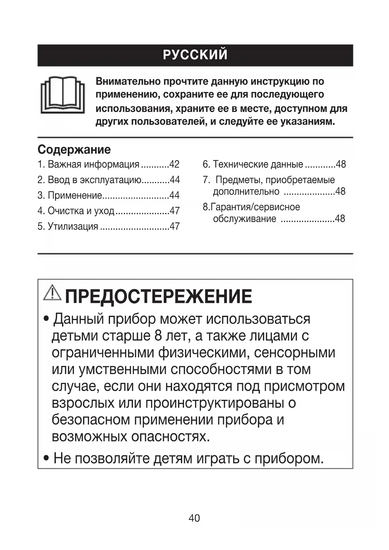 - Данный прибор может использоваться детьми старше 8 лет, а также лицами с ограниченными физическими, сенсорными или умственными способностями в том случае, если они находятся под присмотром взрослых или проинструктированы о безопасном применении прибора и возможных опасностях.