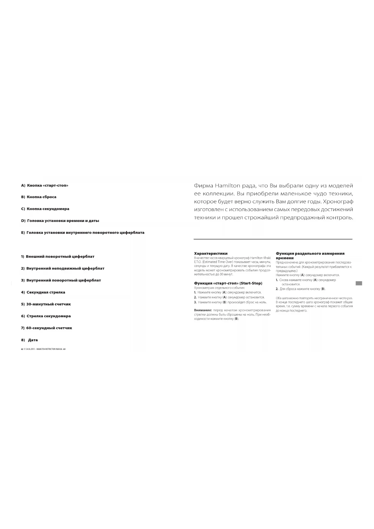 Смена часового пояса и даты Вытяните головку (D) в промежуточное положение (1), чтобы передвигать вперед и назад часовые стрелки, не изменяя положения минутных и секундных стрелок. Смена даты происходит при каждом переходе часовой стрелки через полночь. Примечание: головки (D) и (E) снабжены вну- тренней резьбой для обеспечения оптимальной герметичности. Для установок с помощью этих головок предварительно вывинтите их. После установки снова завинтите головки. Установка времени Когда головка (D) стоит в положении (2), все стрелки – часовые, минутные и секундные – останавливаются, и их можно двигать для установки времени. Регулировка секундомера (Если его стрелки не установлены на ноль.) При двигающейся стрелке секундомера нажмите кнопку (A) для остановки секундомера, затем нажмите кнопку (B): стрелки вернутся в исходное положение. Если же они не установились на ноль, каждую стрелку можно установить на ноль следующим образом: 30-минутный счетчик Головка (D) в положении 1: нажмите кнопку (A) 60-секундный счетчик (белая стрелка секундомера – стрелка промежу- точного времени) Головка (D) в положении 2: нажмите кнопку (A): 60-секундный счетчик (красная стрелка– секундная) Головка (D) в положении 2: нажмите кнопку (B) Примечание: если удерживать головку нажатой более одной секунды, стрелки можно переставлять быстрее. Внимание: Не оставляйте головку в положении 1 более чем на 20 минут. Это может привести к непра- вильной работе функции времени.68 © 24.06.2013 – HAMILTON INSTRUCTION MANUAL 69 Firma Hamilton je potěšena, že jste si vybrali hodinky z její kolekce. Získali jste malý technologický div, který vám bude věrně sloužit po mnoho let. V celém procesu jejich výroby byly používány nejmodernější technologie a před uvolněním k prodeji prošly přísným testováním. Technické údaje Jako hodinky ukazují Hamilton Khaki E.T.O. (Estimated Time Over) hodiny, minuty, vteřiny a datum. Při použití jako stopky může tento model měřit časy až do 30 minut. Funkce Start-Stop Měření jednoho času: