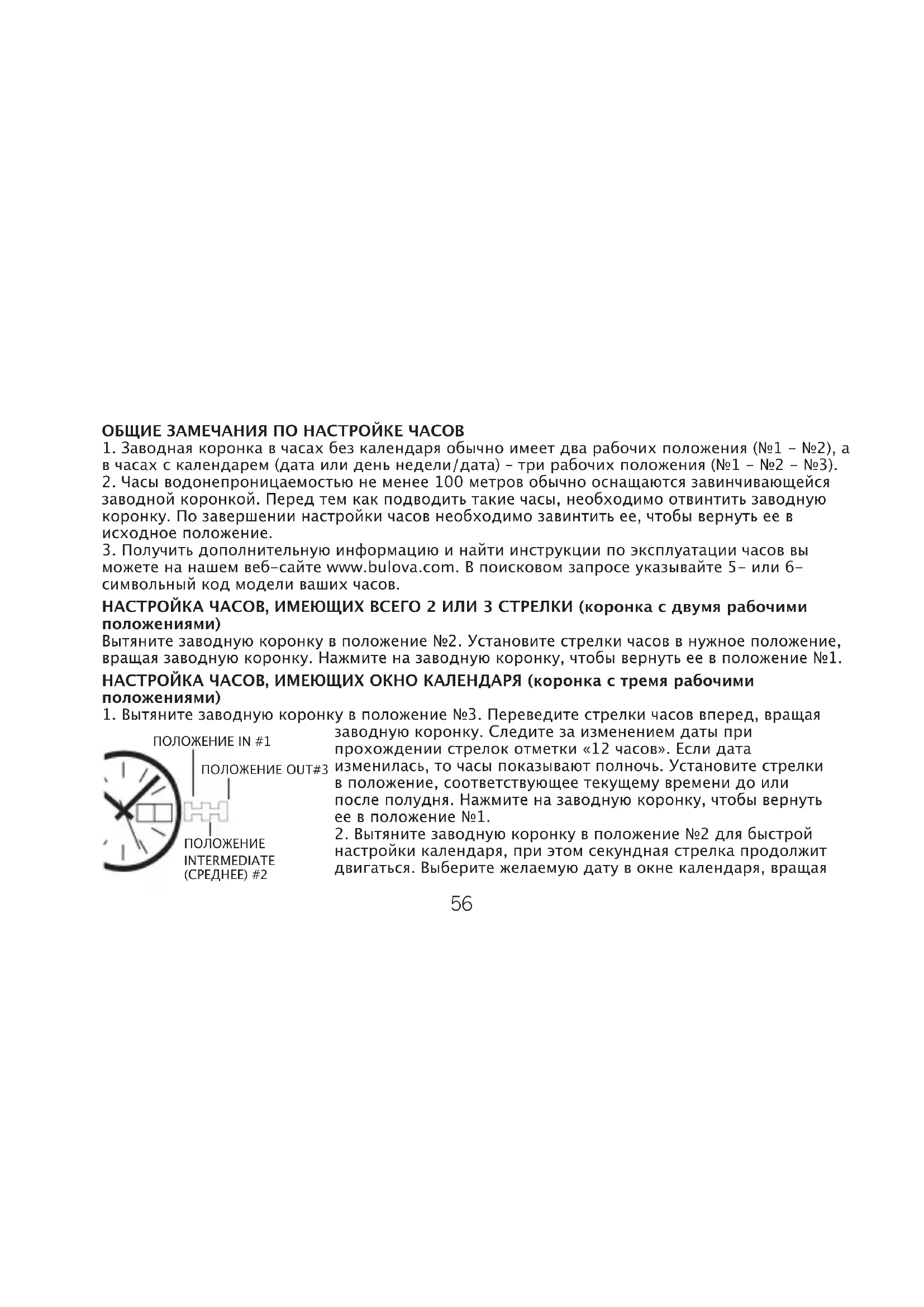 ПОЛОЖЕНИЕ #3 ПОЛОЖЕНИЕ #1 ПОЛОЖЕНИЕ #2 КОРРЕКЦИЯ ДАТЫ КОРРЕКЦИЯ ВРЕМЕНИ КОРРЕКЦИЯ ДНЯ НЕДЕЛИ 24-ЧАСОВОЙ ЦИФЕРБЛАТ (на некоторых моделях)чтобы вернуть ее в положение №1. 2.Вытяните коронку в положение №2 для быстрой настройки даты. Секундная стрелка продолжит двигаться. Настройте текущую дату, медленно вращая заводную коронку. Нажмите на заводную коронку, чтобы вернуть ее в положение №1. МЕХАНИЧЕСКИЕ ЧАСЫ С АВТОПОДЗАВОДОМ Перед тем, как надеть часы, их нужно завести как минимум на шесть-семь оборотов. После этого при ношении часов на руке днем запас их хода станет достаточным для того, чтобы часы шли ночью, когда они не будут надеты. Если Ваша двигательная активность днем недостаточна, время от времени может понадобиться дополнительно заводить часы вручную. Чтобы поддерживать работу Ваших часов безукоризненной, их необходимо периодически чистить и смазывать. Так как это механические часы, точность хода будет уступать кварцевым моделям. Любые упоминания об элементах питания не применимы к автоматическим часам. УО БАТАРЕЙКАХ В Ваших новых кварцевых наручных часах установлена новая батарейка, которая обеспечит Вам приблизительно год безупречной работы часов при их нормальной эксплуатации. Если батарейку не заменить до того, как она «сядет», то часы просто остановятся, механизм не пострадает. Тем не менее, следует заменить батарейку при первом подозрении, что она «садится», чтобы исключить вероятность протечки. Никогда не храните Ваши часы с «севшей» в них батарейкой. Часы необходимо отнести к авторизованному дилеру Bulova, где Вам поставят новую батарейку. Для безупречной работы часов необходимо использовать батарейки хорошего качества. Внимание: Когда заводная коронка находится в положении “OUT”, стрелки и механизм остановятся, но кварцевый кристалл продолжит колебания, потребляя при этом очень небольшое количество энергии. Если часы не будут использоваться долгое время, то заводную коронку рекомендуется вытянуть в положение “OUT”, чтобы продлить срок действия батарейки. 59Гарантия водонепроницаемости Гарантия водонепроницаемости на часы Булова действует только при условии того, что стекло на циферблате и заводная коронка не повреждены, корпус часов закрыт и не превышена глубина погружения, указанная на корпусе часов. Чтобы удостовериться, что часы водонепроницаемы, особенно если это важно для Вашей безопасности, следует заранее проверить часы у компетентного часового мастера. Если необходимо, часы следует отремонтировать. Кроме того, не следует проводить никаких манипуляций с заводной коронкой во время погружения. ВОДОНЕПРОНИЦАЕМОСТЬ Часы, маркированные на задней крышке “Water Resistant” («Водонепроницаемые»), без указания глубины не предназначены для плавания. Для плавания рекомендованы часы, на циферблате которых есть маркировка «50м», «100м» или «200м». BULOVA – ТРЕХЛЕТНЯЯ ОГРАНИЧЕННАЯ ГАРАНТИЯ: Bulova предоставляет гарантию на новые часы только первоначальному владельцу в течение трех лет со дня покупки. Условия данной гарантии вступают в силу только при наличии правильно заполненной при покупке авторизованным дилером гарантийной карты и/или наличии копии документа, подтверждающего оплату. На что распространяется данная гарантия: Гарантия распространяется на детали часов, вышедшие из строя при нормальных условиях экс