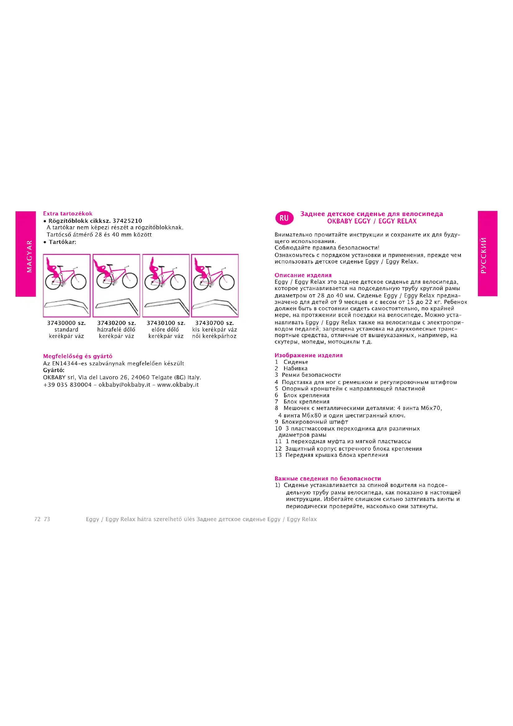Внимательно прочитайте инструкции и сохраните их для буду- щего использования. Соблюдайте правила безопасности! Ознакомьтесь с порядком установки и применения, прежде чем использовать детское сиденье Eggy / Eggy Relax. Описание изделия Eggy / Eggy Relax это заднее детское сиденье для велосипеда, которое устанавливается на подседельную трубу круглой рамы диаметром от 28 до 40 мм. Сиденье Eggy / Eggy Relax предна- значено для детей от 9 месяцев и с весом от 15 до 22 кг. Ребенок должен быть в состоянии сидеть самостоятельно, по крайней мере, на протяжении всей поездки на велосипеде. Можно уста- навливать Eggy / Eggy Relax также на велосипеды с электропри- водом педалей; запрещена установка на двухколесные транс- портные средства, отличные от вышеуказанных, например, на скутеры, мопеды, мотоциклы т.д. Изображение изделия 1 Сиденье 2 Набивка 3 Ремни безопасности 4 Подставка для ног с ремешком и регулировочным штифтом 5 Опорный кронштейн с направляющей пластиной 6 Блок крепления 7 Блок крепления 8 Мешочек с металлическими деталями: 4 винта M6x70, 4 винта M6x80 и один шестигранный ключ. 9 Блокировочный штифт 10 3 пластмассовых переходника для различных диаметров рамы 11 1 переходная муфта из мягкой пластмассы 12 Защитный корпус встречного блока крепления 13 Передняя крышка блока крепления