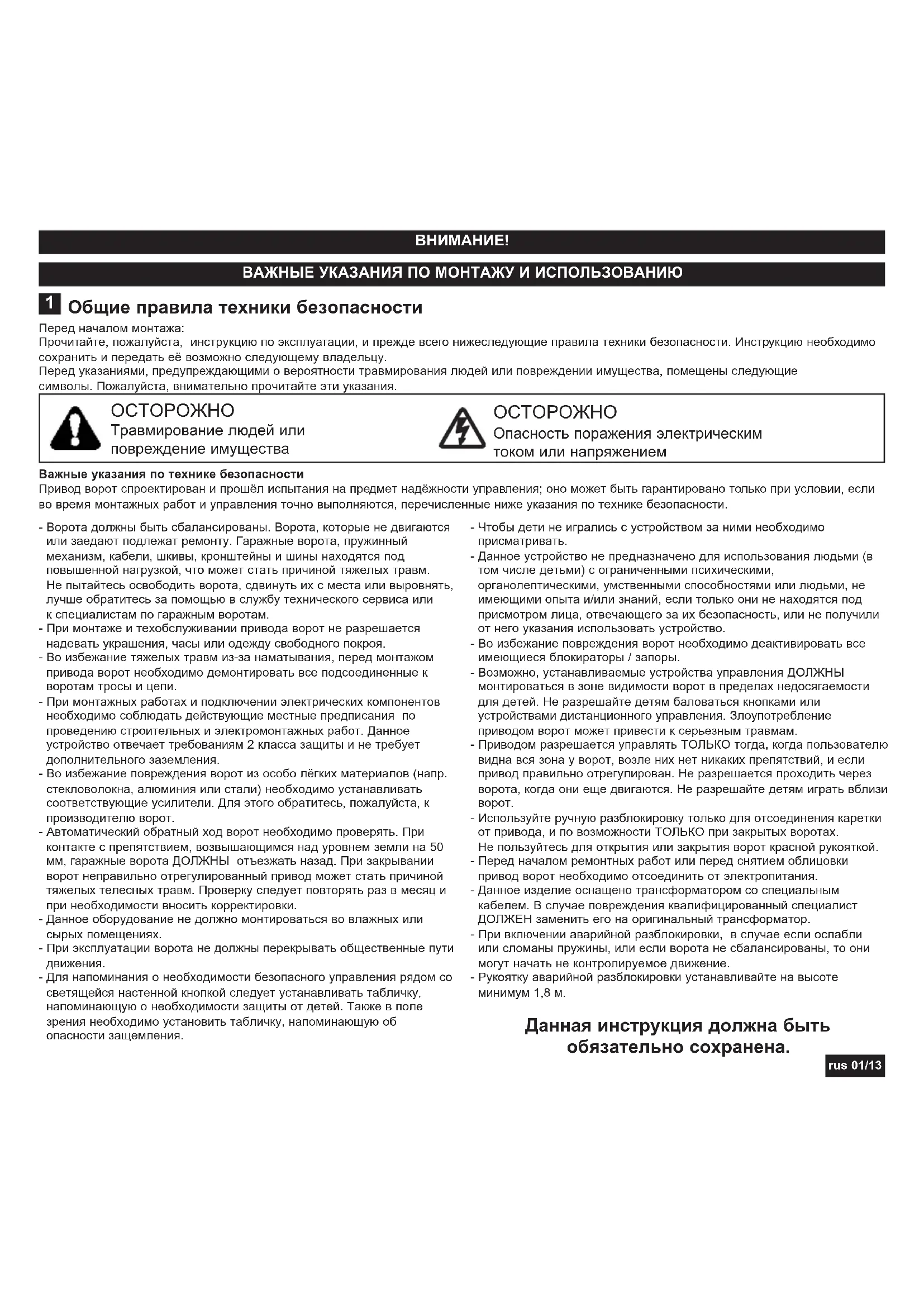 - 37 Заявление о соответствии rus 01/13 Общие правила техники безопасности Перед началом монтажа: Прочитайте, пожалуйста, инструкцию по эксплуатации, и прежде всего нижеследующие правила техники безопасности. Инструкцию необходимо сохранить и передать её возможно следующему владельцу. Перед указаниями, предупреждающими о вероятности травмирования людей или повреждении имущества, помещены следующие символы. Пожалуйста, внимательно прочитайте эти указания. Важные указания по технике безопасности Привод ворот спроектирован и прошёл испытания на предмет надёжности управления; оно может быть гарантировано только при условии, если во время монтажных работ и управления точно выполняются, перечисленные ниже указания по технике безопасности. p. 13