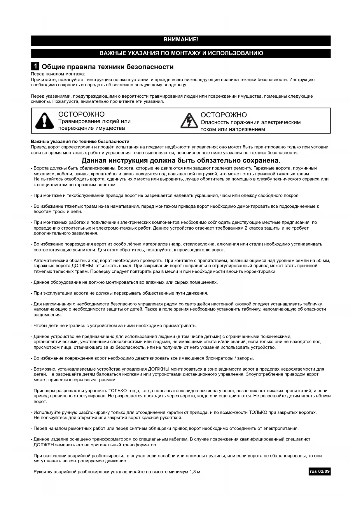 rus 02/09Использование по назначению Устройство предназначается для открывания и закрывания подъемных и секционных гаражных ворот в частном секторе. Устройство не предназначено для промышленного применения, а исключительно для использования на воротах частных гаражей, используемых для одного домовладения. Использование привода не по назначению может привести к несчастному случаю. Производитель не несёт ответственности в случае использования не по назначению. Комплект поставки Перед началом монтажа проверьте, пожалуйста, наличие всех деталей комплекта. Примечание: Нумерация деталей относится только к данной главе. Обзор изделия На данном рисунке показан пошаговый монтаж устройства и полный обзор полностью установленного устройства. Перед началом монтажа ВАЖНОЕ ПРИМЕЧАНИЕ Если Ваш гараж не имеет бокового входа, то необходимо установить наружное аварийное устройство разблокировки. Это позволит открыть гаражные ворота снаружи вручную при отключении напряжения. Предварительные условия Устройство открывания гаражных ворот предназначено для установки вместе с одностворчатыми гаражными воротами с горизонтальной ходовой шиной (подъемные ворота, рис. А) и с секционными воротами с изогнутой ходовой шиной (рис. В). ПРИМЕЧАНИЕ: Использование устройства вместе с одностворчатыми гаражными воротами с горизонтальными и вертикальными ходовыми шинами и с двухстворчатыми воротами или с подъемно-поворотными воротами невозможно.