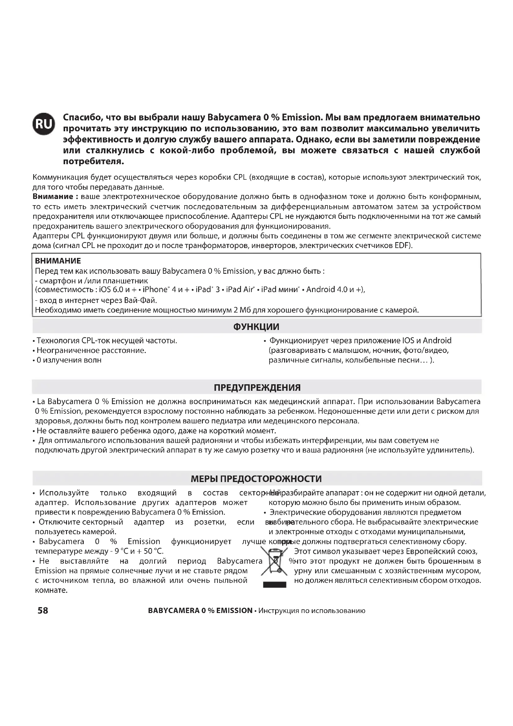 tɵʜʧʖʞʗʟʧʖʠʩʜʖʦʖʦʖʧʖʩʥʤʤʜʨʥʛʜʧʝʟʩʤʟʥʛʤʥʠʛʜʩʖʢʟ которую можно было бы применить иным образом. tʅʢʜʡʩʧʟʮʜʨʡʟʜʥʗʥʧʪʛʥʘʖʤʟʶʶʘʢʶʵʩʨʶʦʧʜʛʣʜʩʥʣ избирательного сбора. Не выбрасывайте электрические и электронные отходы с отходами муниципальными, которые должны подтвергаться селективному сбору. ʅʩʥʩʨʟʣʘʥʢʪʡʖʞʲʘʖʜʩʮʜʧʜʞɭʘʧʥʦʜʠʨʡʟʠʨʥʵʞ что этот продукт не должен быть брошенным в урну или смешанным с хозяйственным мусором, но должен являться селективным сбором отходов. МЕРЫ ПРЕДОСТОРОЖНОСТИ t-B#BCZDBNFSB&NJTTJPO ʤʜ ʛʥʢʝʤʖʘʥʨʦʧʟʤʟʣʖʩʳʨʶʡʖʡʣʜʛʜʭʟʤʨʡʟʠ ʖʦʦʖʧʖʩɷʧʟʟʨʦʥʢʳʞʥʘʖʤʟʟ#BCZDBNFSB 0 % Emission, рекомендуется взрослому постоянно наблюдать за ребенком. Недоношенные дети или дети с риском для здоровья, должны быть под контролем вашего педиатра или медецинского персонала. tɵʜʥʨʩʖʘʢʶʠʩʜʘʖʯʜʙʥʧʜʗʜʤʡʖʥʛʥʙʥʛʖʝʜʤʖʡʥʧʥʩʡʟʠʣʥʣʜʤʩ tɬʢʶʥʦʩʟʣʖʢʳʙʥʙʥʟʨʦʥʢʳʞʥʘʖʤʟʶʘʖʯʜʠʧʖʛʟʥʤʶʤʟʟʮʩʥʗʲʟʞʗʜʝʖʩʳʟʤʩʜʧʫʟʧʜʤʭʟʟʣʲʘʖʣʨʥʘʜʩʪʜʣʤʜ подключать другой электрический аппарат в ту же самую розетку что и ваша радионяня (не используйте удлинитель). ПРЕДУПРЕЖДЕНИЯ BABYCAMERA 0 % EMISSIONtИнструкция по использованию 58BABYCAMERA 0 % EMISSIONtИнструкция по использованию