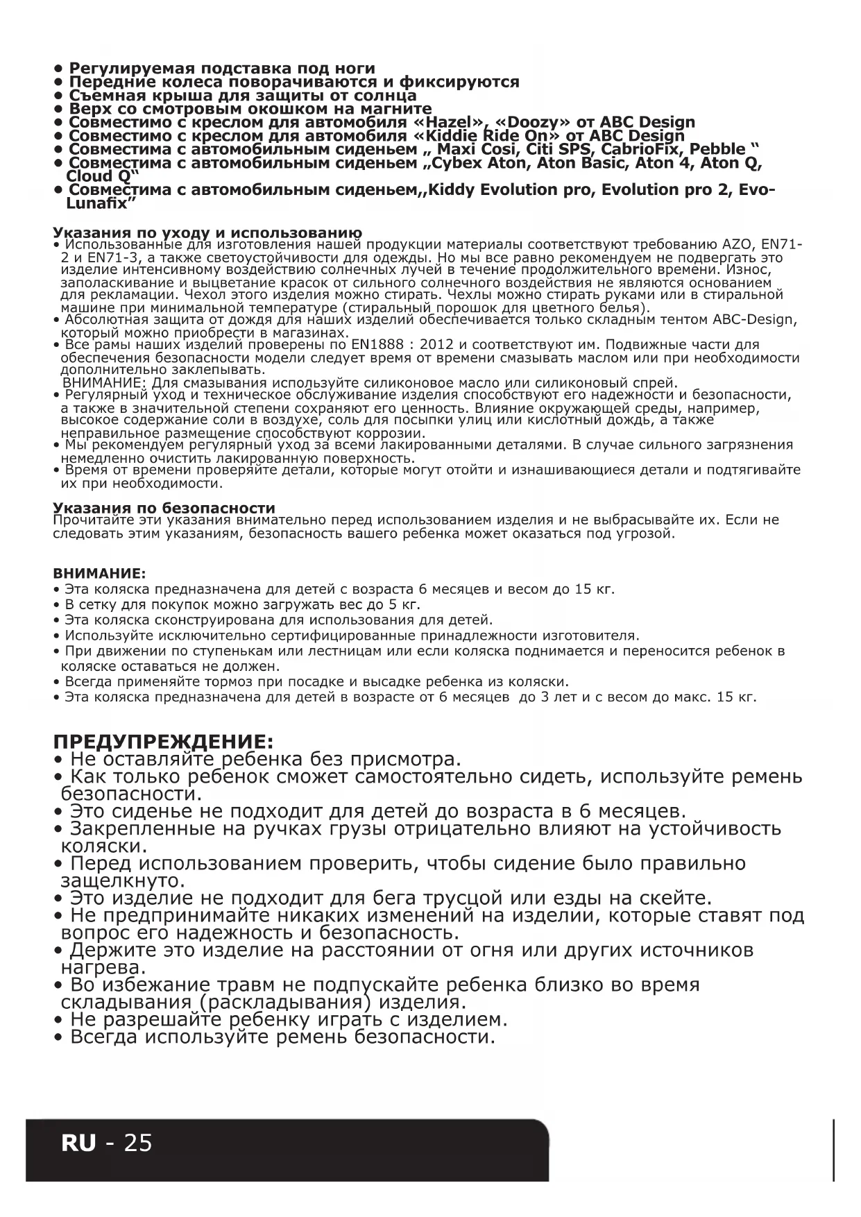 - Абсолютная защита от дождя для наших изделий обеспечивается только складным тентом ABC-Design, который можно приобрести в магазинах.