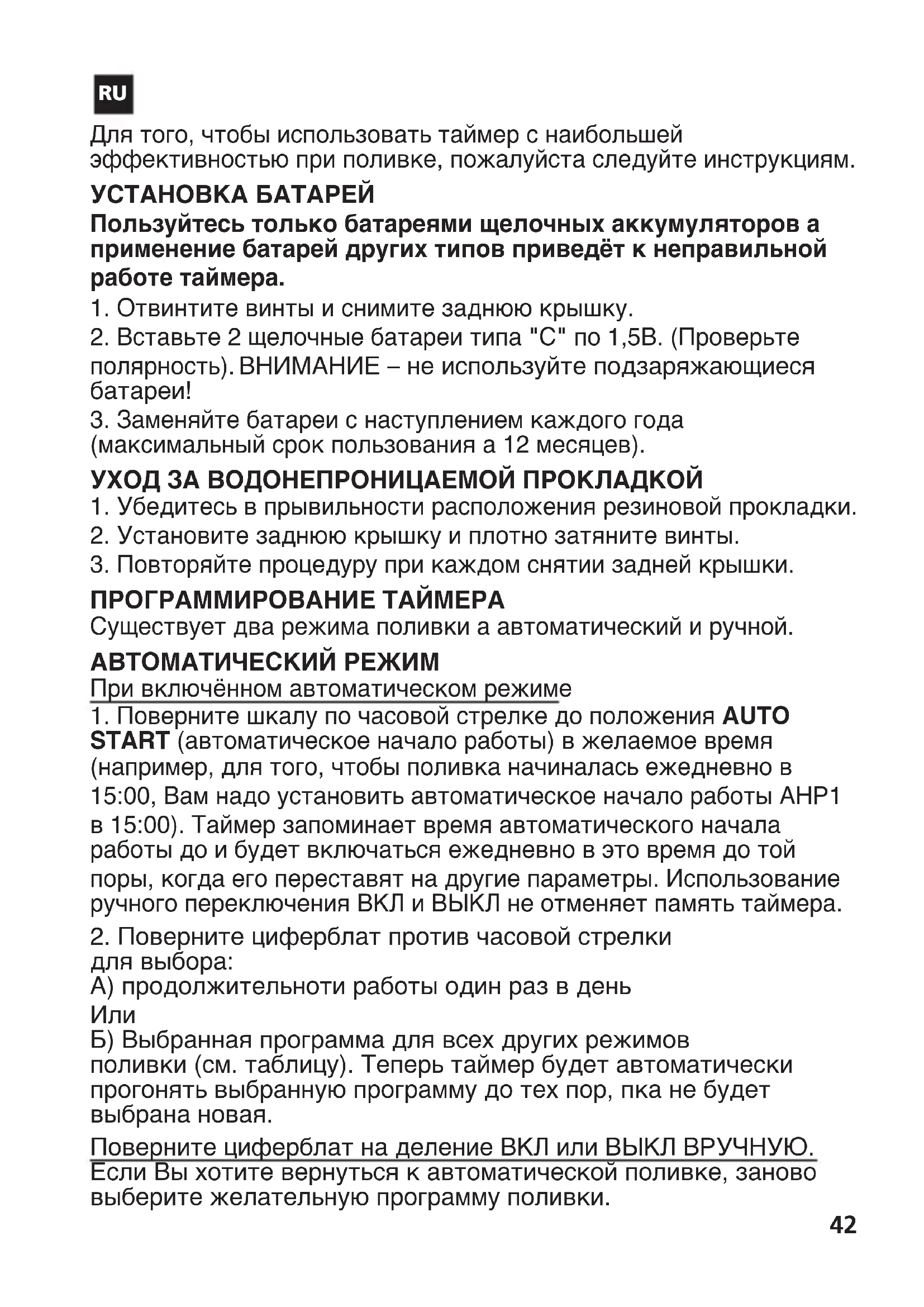 ПРИСОЕДИНЕНИЕ ТАЙМЕРА К ВОДОПРОВОДНОМУ КРАНУ При необходимости, пользуйтесь входящим в комплект переходником. Плотно затаните во избежание утечки. ПРЕДОХРАНЯЙТЕ ВАШ ВОДЯНОЙ ТАЙМЕР ОТ МОРОЗА. СНИМАЙТЕ ЕГО С КРАНА В ЗИМНЕЕ ВРЕМЯ. ИЗДЕЛИЕ НЕ НАХОДИТСЯ ПОД ГАРАНТИЕЙ ПРОТИВ ПОВРЕЖДЕНИЯ НИЗКИМИ ТЕМПЕРАТУРАМИ. В НЕРАБОЧЕМ СОСТОЯНИИ ТАЙМЕРА, УДАЛИТЕ ИЗ НЕГО БАТАРЕЙКИ.44 ОПИСАНИЕ ПРОГРАММ 2 минуты Клапан открывается каждые 2 минуты в течение 24 часов. 5 минут Клапан открывается каждые 5 минут в течение 24 часов 15 минут Клапан открывается каждые 15 минут в течение 24 часов 30 минут Клапан открывается каждые 30 минут в течение 24 часов 60 минут Клапан открывается каждые 60 минут в течение 24 часов Р1 Клапан открывается каждые 2 минуты каждые 6 часов Р2 Клапан открывается каждые 2 минуты каждые 12 часов Р3 Клапан открывается каждые 10 минуты каждые 12 часов Р4 Клапан открывается каждые 15 минут каждые 2 дня Р5 Клапан открывается каждые 60 минут каждые 2 дня Р6 Клапан открывается каждые 30 минут каждые 3 дня Р7 Клапан открывается каждые 60 минут каждые 3 дня Р8 Клапан открывается каждые 120 минут каждые 7 дней