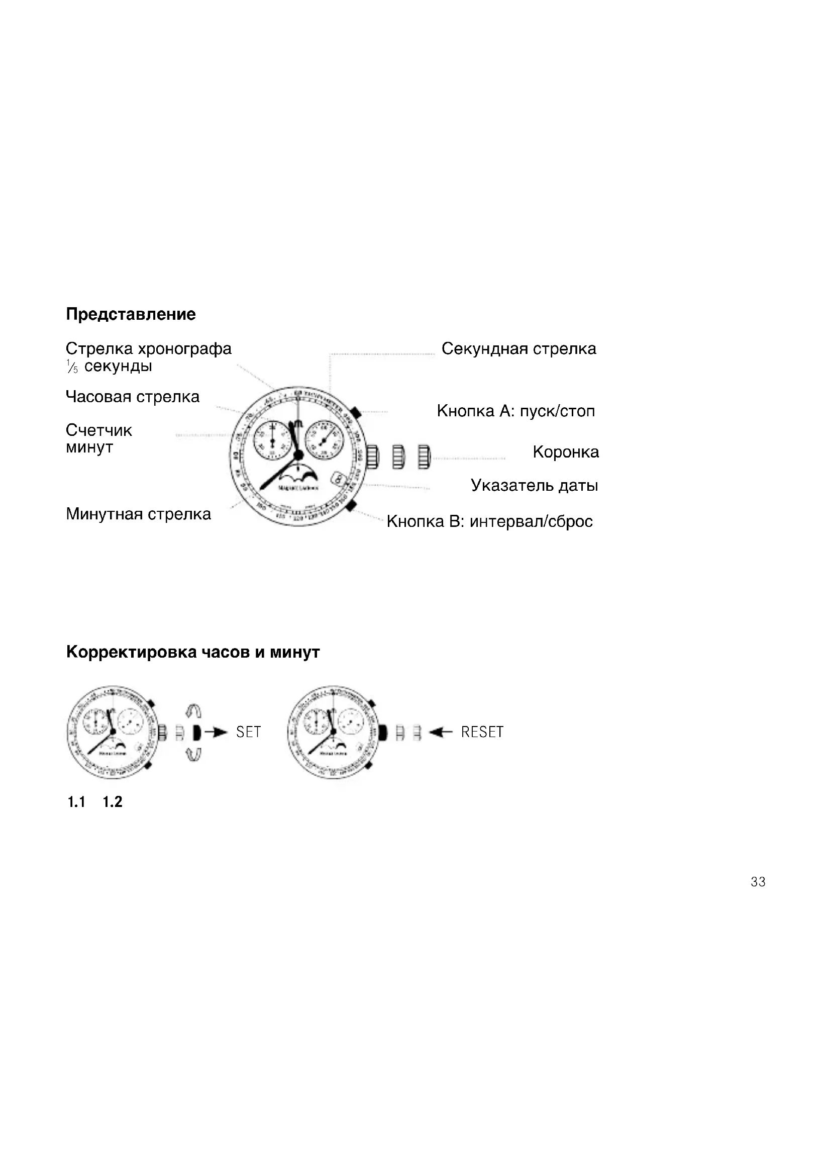 Кнопка В: интервал/сброс Указатель даты Стрелка хронографа