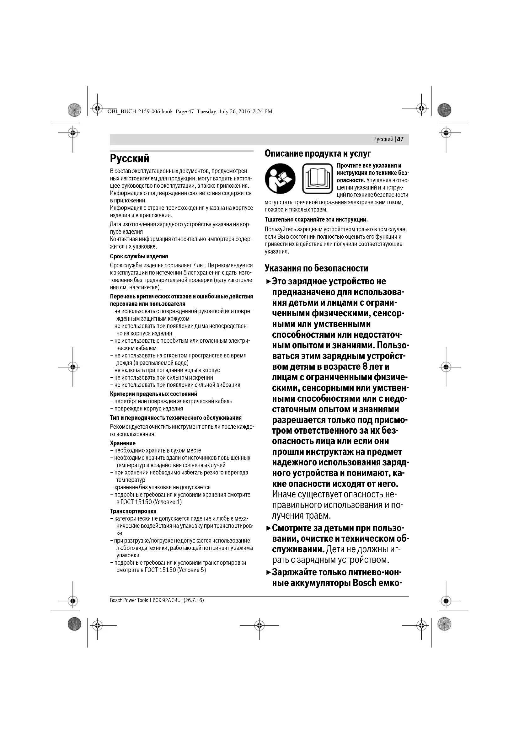 – подробные требования к условиям транспортировки смотрите в ГОСТ 15150 (Условие 5) Описание продукта и услуг Прочтите все указания и инструкции по технике без- опасности. Упущения в отно- шении указаний и инструк- ций по технике безопасности могут стать причиной поражения электрическим током, пожара и тяжелых травм. Тщательно сохраняйте эти инструкции. Пользуйтесь зарядным устройством только в том случае, если Вы в состоянии полностью оценить его функции и привести их в действие или получили соответствующие