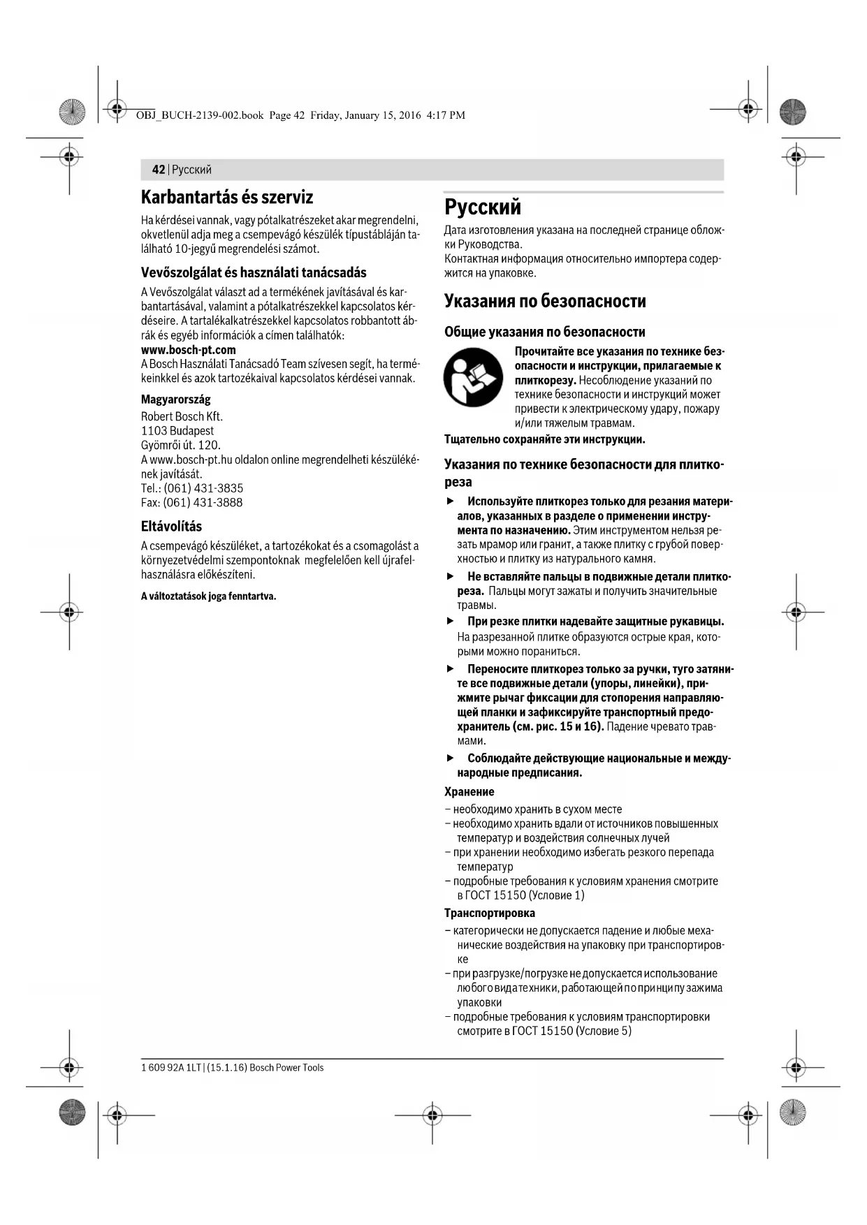 Сила прижима при осуществлении надреза на плитке слишком большая При осуществлении надреза не так сильно нажимайте на рычаг для надреза и разлома 1 OBJ_BUCH-2139-002.book Page 43 Friday, January 15, 2016 4:17 PM44 | Русский 1 609 92A 1LT | (15.1.16) Bosch Power Tools Техобслуживание и сервис При всех дополнительных вопросах и заказе запчастей, пожалуйста, обязательно указывайте 10-значный товар- ный номер, указанный на заводской табличке плиткореза. Сервис и консультирование на предмет ис- пользования продукции Сервисная мастерская ответит на все Ваши вопросы по ремонту и обслуживанию Вашего продукта и по запча- стям. Монтажные чертежи и информацию по запчастям Вы найдете также по адресу: www.bosch-pt.com Коллектив сотрудников Bosch, предоставляющий кон- сультации на предмет использования продукции, с удо- вольствием ответит на все Ваши вопросы относительного нашей продукции и ее принадлежностей. Для региона: Россия, Беларусь, Казахстан, Украина Гарантийное обслуживание и ремонт электро- инструмента, с соблюдением требований и норм изгото- вителя производятся на территории всех стран только в фирменных или авторизованных сервисных центрах «Ро-
