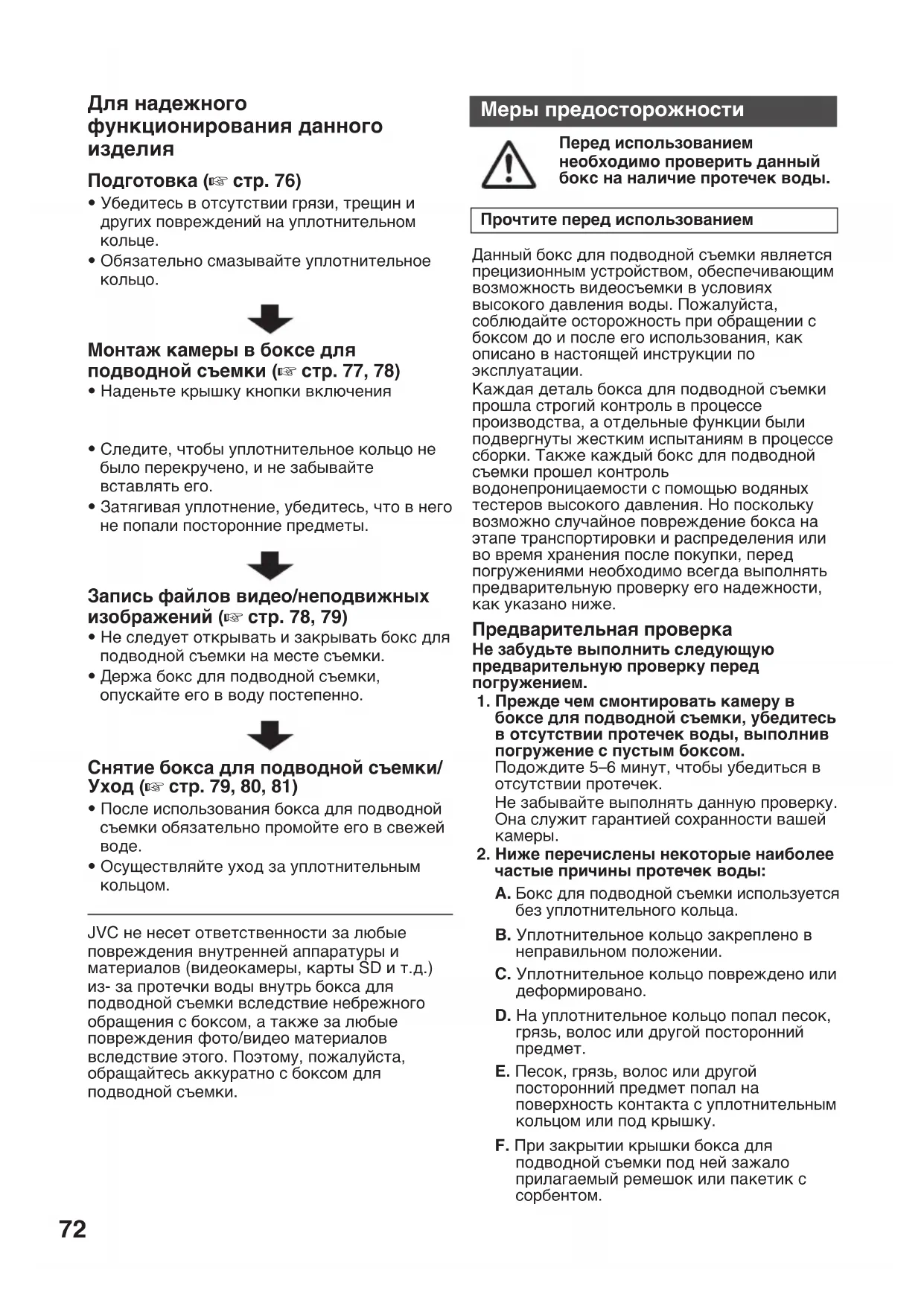 на наличие царапин и трещин при каждом использовании. При использовании бокс для подводной съемки противостоит давлению воды. Повторяющееся воздействие давления вызывает, в конечном итоге, усталость материала, которая может привести к повреждению бокса для подводной съемки. Проверяйте бокс для подводной съемки на наличие царапин и трещин при каждом использовании. Если бокс для подводной съемки используется часто, попросите выполнить его техобслуживании по месту покупки. (Техобслуживание является платным.) Для обеспечения сохранности камеры и оптимальной эффективности использования бокса для подводной съемки имейте в виду вышеперечисленные примеры. JVC не несет ответственности за протечки воды и повреждения чего-либо внутри бокса для подводной съемки (видеокамеры, карты SD и т.д.) вследствие небрежного обращения с данным изделием. При использовании бокса для подводной съемки обязательно следуйте предписанным процедурам.