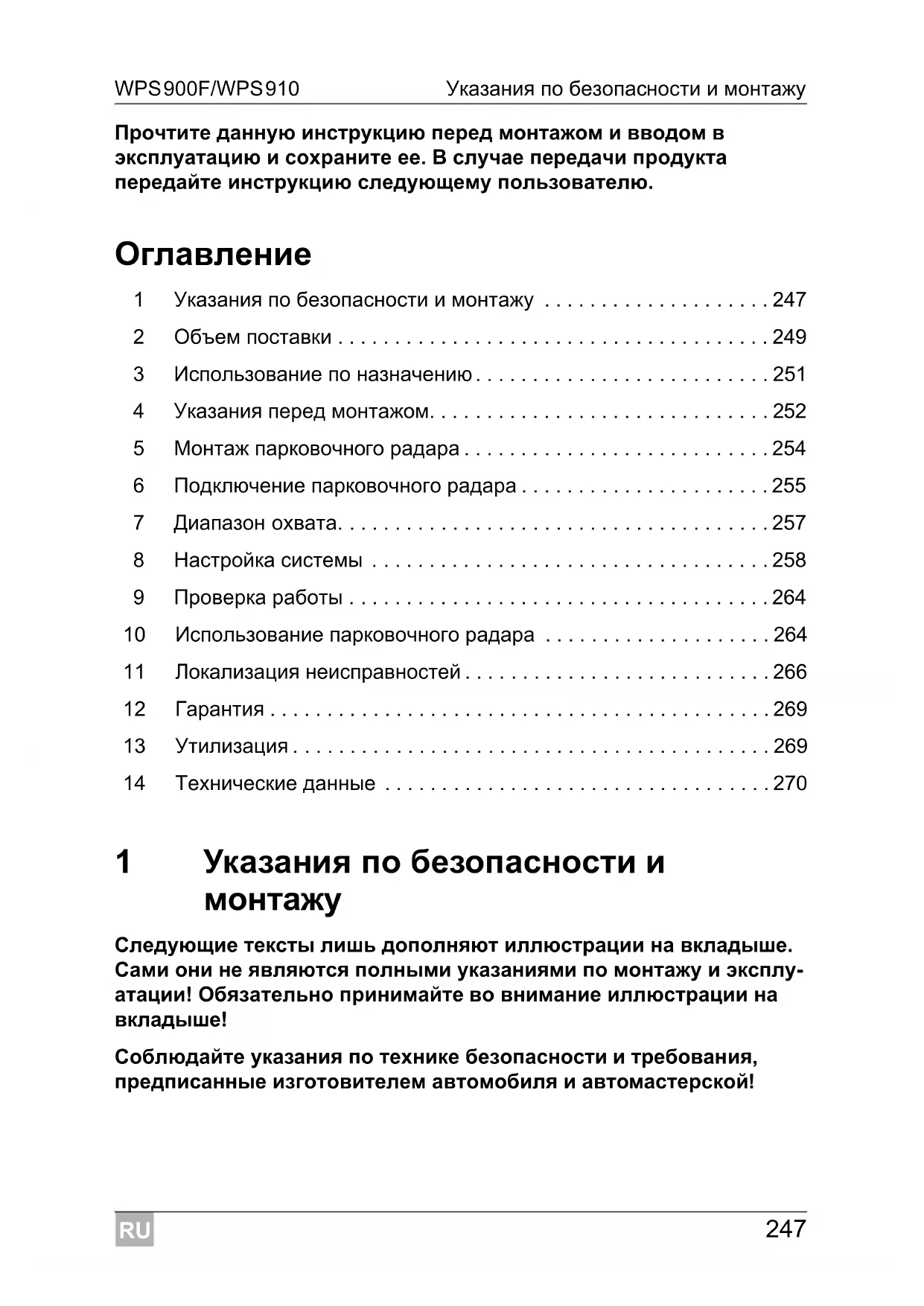 Соблюдайте указания по технике безопасности и требования, предписанные изготовителем автомобиля и автомастерской!RU Указания по безопасности и монтажу WPS900F/WPS910