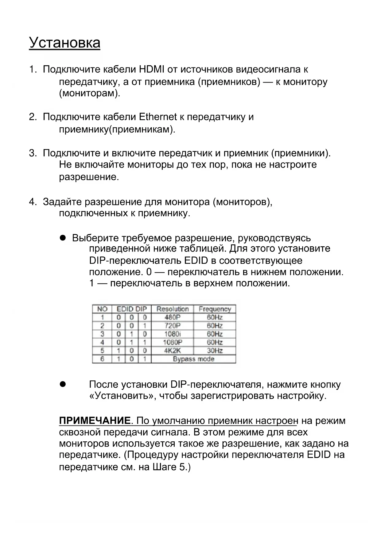 подключенных к приемнику. Выберите требуемое разрешение, руководствуясь приведенной ниже таблицей. Для этого установите DIP-переключатель EDID в соответствующее положение. 0 — переключатель в нижнем положении. 1 — переключатель в верхнем положении. После установки DIP-переключателя, нажмите кнопку «Установить», чтобы зарегистрировать настройку. ПРИМЕЧАНИЕ. По умолчанию приемник настроен на режим сквозной передачи сигнала. В этом режиме для всех мониторов используется такое же разрешение, как задано на передатчике. (Процедуру настройки переключателя EDID на передатчике см. на Шаге 5.)ПРИМЕЧАНИЕ. Настройка передатчика и приемника по умолчанию — для всех подключенных мониторов на передатчике и приемнике задано разрешение видеосигнала 1080p при частоте кадров 60 Гц. ПРИМЕЧАНИЕ. На приемнике задан режим сквозной передачи видеосигнала, а передатчик считывает EDID С ЛОКАЛЬНОГО МОНИТОРА — передатчик автоматически считывает EDID с подключенного монитора и передает эту настройку на все мониторы, подключенные к приемнику. Если непосредственно к передатчику не подключен локальный монитор, EDID не будет определяться, что может вызвать ошибку отображения.