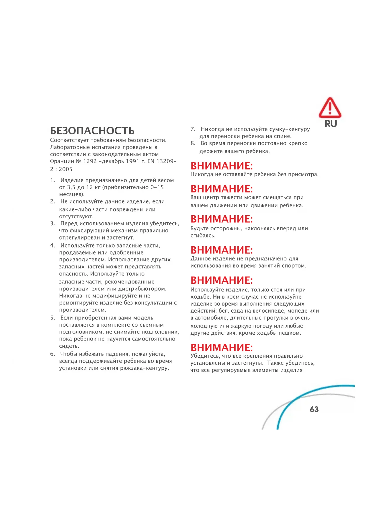 57K БЕЗОПАСНОСТЬ Соответствует требованиям безопасности. Лабораторные испытания проведены в соответствии с законодательным актом Франции № 1292 -декабрь 1991 г. EN 13209-2 : 2005 1. Изделие предназначено для детей весом от 3,5 до 12 кг (приблизительно 0-15 месяцев). 2. Не используйте данное изделие, если какие-либо части повреждены или отсутствуют. 3. Перед использованием изделия убедитесь, что фиксирующий механизм правильно отрегулирован и застегнут. 4. Используйте только запасные части, продаваемые или одобренные производителем. Использование других запасных частей может представлять опасность. Используйте только запасные части, рекомендованные производителем или дистрибьютором. Никогда не модифицируйте и не ремонтируйте изделие без консультации с производителем. 5. Если приобретенная вами модель поставляется в комплекте со съемным подголовником, не снимайте подголовник, пока ребенок не научится самостоятельно сидеть.6. Чтобы избежать падения, пожалуйста, всегда поддерживайте ребенка во время установки или снятия рюкзака-кенгуру.7. Никогда не используйте сумку-кенгуру для переноски ребенка на спине.8. Во время переноски постоянно крепко держите вашего ребенка. Никогда не оставляйте ребенка без присмотра. Ваш центр тяжести может смещаться при вашем движении или движении ребенка. Будьте осторожны, наклоняясь вперед или сгибаясь. Данное изделие не предназначено для использования во время занятий спортом. Используйте изделие, только стоя или при ходьбе. Ни в коем случае не используйте изделие во время выполнения следующих действий: бег, езда на велосипеде, мопеде или в автомобиле, длительные прогулки в очень холодную или жаркую погоду или любые другие действия, кроме ходьбы пешком. Убедитесь, что все крепления правильно установлены и застегнуты. Также убедитесь, что все регулируемые элементы изделия