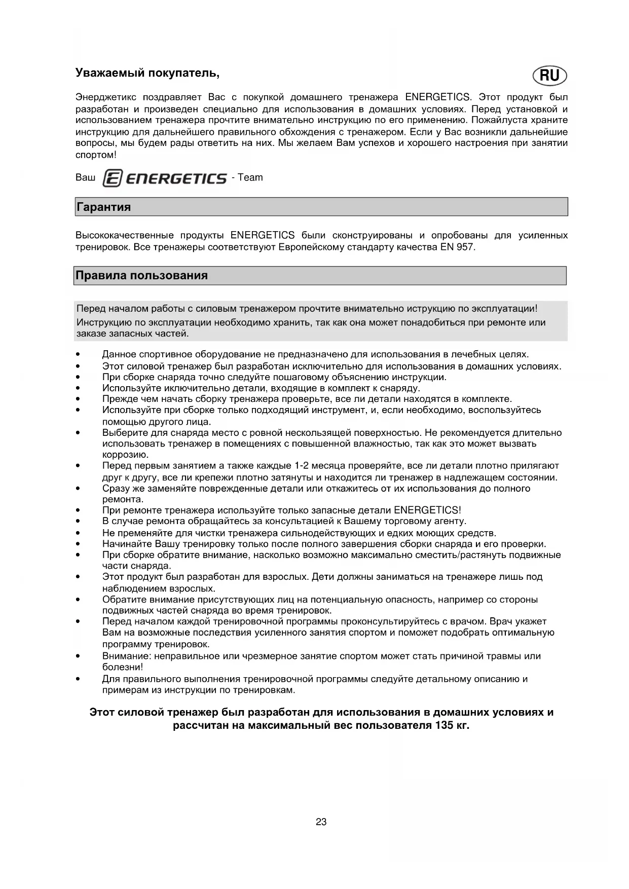 Уважаемый покупатель, Энерджетикс поздравляет Вас с покупкой домашнего тренажера ENERGETICS. Этот продукт был разработан и произведен специально для использования в домашних условиях. Перед установкой и использованием тренажера прочтите внимательно инструкцию по его применению. Пожайлуста храните инструкцию для дальнейшего правильного обхождения с тренажером. Если у Вас возникли дальнейшие вопросы, мы будем рады ответить на них. Мы желаем Вам успехов и хорошего настроения при занятии