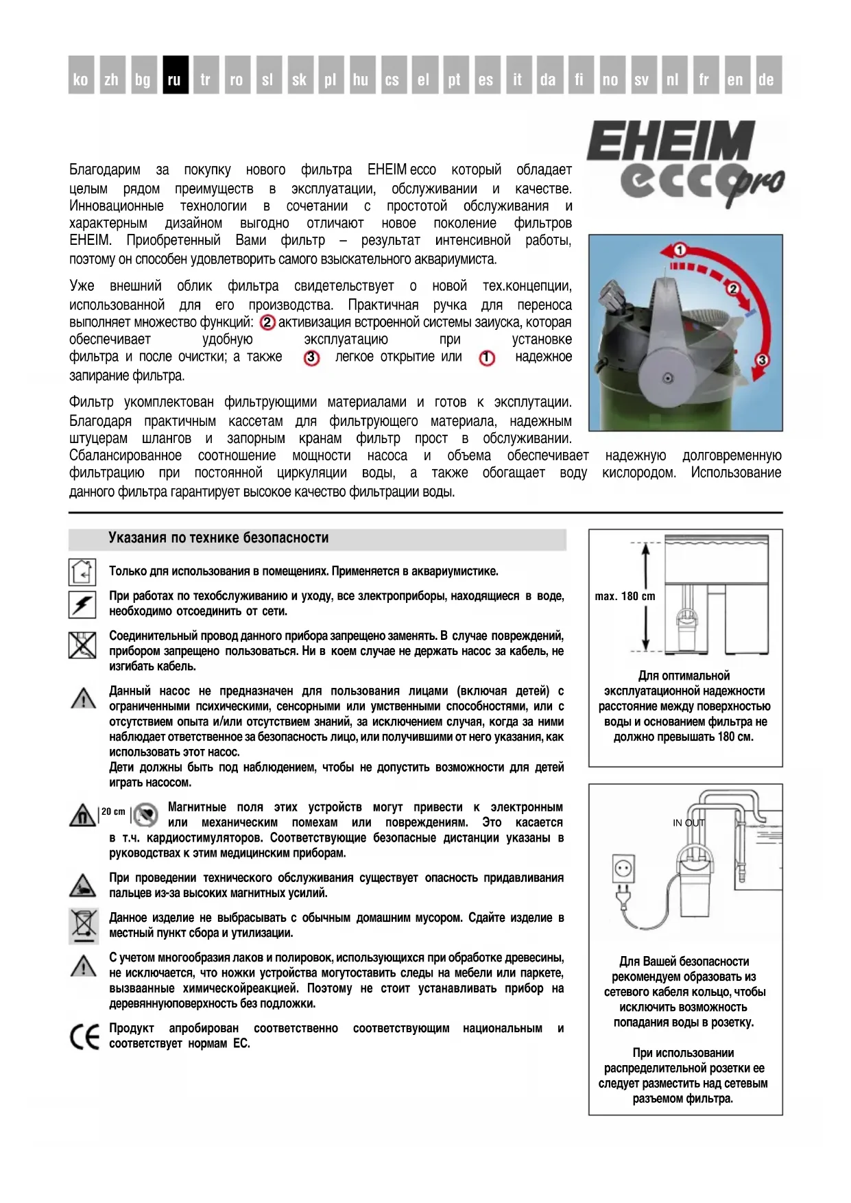3Только дпя использования в помещениях. Применяется в аквариумистике. При работах по техобслуживанию и уходу, все злектроприборы, находящиеся в воде, необходимо отсоединить от сети. Соединительный провод данного прибора запрещено заменять. В случае повреждений, прибором запрещено пользоваться. Ни в коем случае не держать насос за кабель, не изгибать кабель. Данный насос не предназначен для пользования лицами (включая детей) с ограниченными психическими, сенсорными или умственными способностями, или с отсутствием опыта и/или отсутствием знаний, за исключением случая, когда за ними наблюдает ответственное за безопасность лицо, или получившими от него указания, как использовать этот насос. Дети должны быть под наблюдением, чтобы не допустить возможности для детей играть насосом. Магнитные поля этих устройств могут привести к электронным или механическим помехам или повреждениям. Это касается в т.ч. кардиостимуляторов. Соответствующие безопасные дистанции указаны в руководствах к этим медицинским приборам. При проведении технического обслуживания существует опасность придавливания пальцев из-за высоких магнитных усилий. Данное изделие не выбрасывать с обычным домашним мусором. Сдайте изделие в местный пункт сбора и утилизации. С учетом многообразия лаков и полировок, использующихся при обработке древесины, не исключается, что ножки устройства могутоставить следы на мебели или паркете, вызваанные химическойреакцией. Поэтому не стоит устанавливать прибор на деревяннуюповерхность без подложки. Продукт апробирован соответственно соответствующим национальным и соответствует нормам EC. 20 cm Указания по технике безопасности max. 180 cm Для оптимальной эксплуатационной надежности расстояние между поверхностью воды и основанием фильтра не должно превышать 180 cм. IN OUT Для Вашей безопасности рекомендуем образовать из сетевого кабеля кольцо, чтобы исключить возможность попадания воды в розетку. При использовании распределительной розетки ее следует разместить над сетевым разъемом фильтра. Благодарим за покупку нового фильтра EHEIM ecco который обладает целым рядом преимуществ в эксплуатации, обслуживании и качестве. Инновационные технологии в сочетании с простотой обслуживания и характерным дизайном выгодно отличают новое поколение фильтров EHEIM. Приобретенный Вами фильтр – результат интенсивной работы, поэтому он способен удовлетворить самого взыскательного аквариумиста. Уже внешний облик фильтра свидетельствует о новой тех.концепции, использованной для его производства. Практичная ручка для переноса выполняет множество функций: активизация встроенной системы заиуска, которая обеспечивает удобную эксплуатацию при установке фильтра и после очистки; а также легкое открытие или надежное запирание фильтра. Фильтр укомплектован фильтрующими материалами и готов к эксплутации. Благодаря практичным кассетам для фильтрующего материала, надежным штуцерам шлангов и запорным кранам фильтр прост в обслуживании. Сбалансированное соотношение мощности насоса и объема обеспечивает надежную долговременную фильтрацию при постоянной циркуляции воды, а также обогащает воду кислородом. Использование данного фильтра гарантирует высокое качество фильтрации воды.