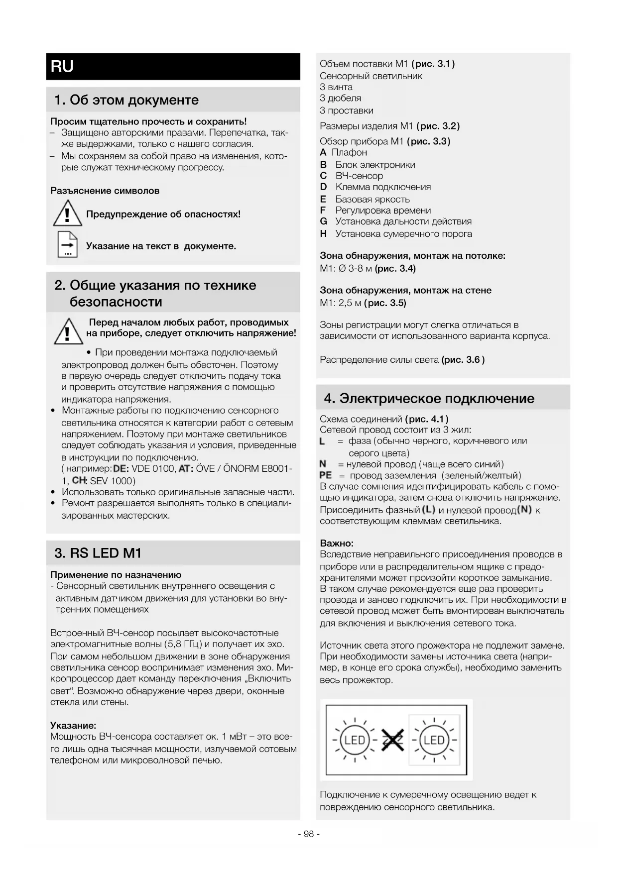LV- 98 - Объем поставки М1 ( рис.3.1 ) Сенсорный светильник 3 винта 3 дюбеля 3 проставки Размеры изделия М1 ( рис.3.2 ) Обзор прибора М1 ( рис.3.3 ) A Плафон B Блок электроники C ВЧ-сенсор D Клемма подключения Е Базовая яркость F Регулировка времени G Установка дальности действия H Установка сумеречного порога Зона обнаружения, монтаж на потолке: M1: Ø 3-8 м (рис.3.4) Зона обнаружения, монтаж на стене M1: 2,5 м ( рис.3.5) Зоны регистрации могут слегка отличаться в зависимости от использованного варианта корпуса. Распределение силы света (рис.3.6 )