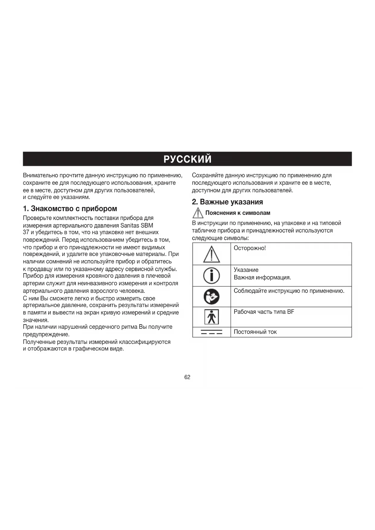 Проверьте комплектность поставки прибора для измерения артериального давления Sanitas SBM 37 иубедитесь втом, что на упаковке нет внешних повреждений. Перед использованием убедитесь втом, что прибор иего принадлежности неимеют видимых повреждений, иудалите все упаковочные материалы. При наличии сомнений не используйте прибор иобратитесь кпродавцу или по указанному адресу сервисной службы. Прибор для измерения кровяного давления вплечевой артерии служит для неинвазивного измерения иконтроля артериального давления взрослого человека. Сним Вы сможете легко ибыстро измерить свое артериальное давление, сохранить результаты измерений впамяти ивывести на экран кривую измерений исредние