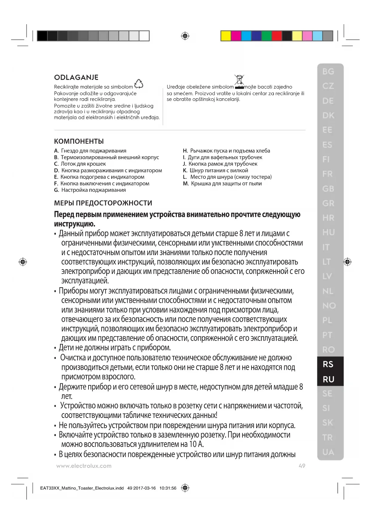 - В целях безопасности поврежденные устройство или шнур питания должны EAT33XX_Mattino_Toaster_Electrolux.indd 49 2017-03-16 10:31:5650 www.electrolux.com