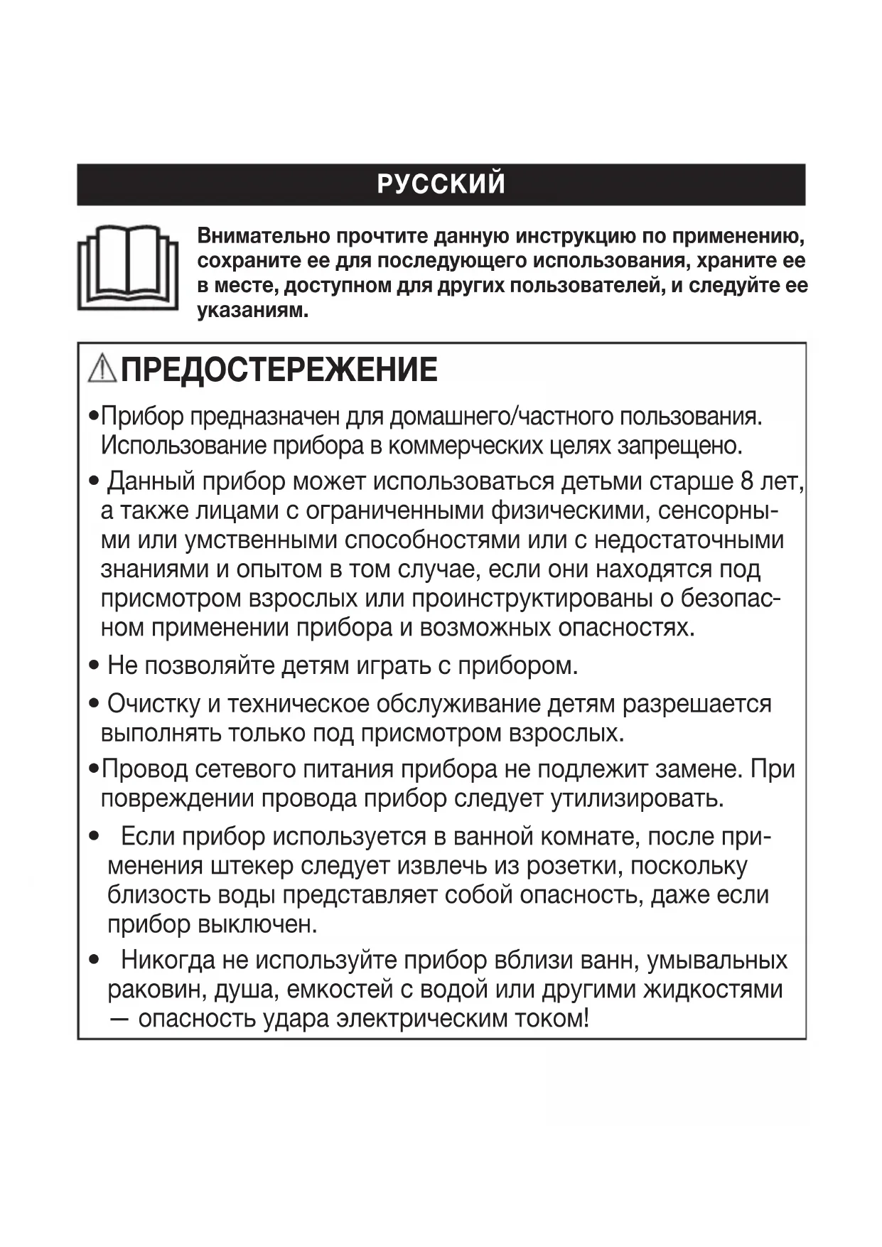 Никогда не используйте прибор вблизи ванн, умывальных раковин, душа, емкостей с водой или другими жидкостями — опасность удара электрическим током! Внимательно прочтите данную инструкцию по применению, сохраните ее для последующего использования, храните ее вместе, доступном для других пользователей, иследуйте ее указаниям.80