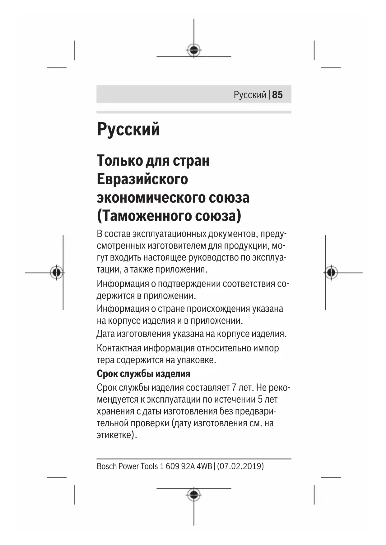 Toлько для стран Евразийского экономического союза (Таможенного союза) В состав эксплуатационных документов, преду- смотренных изготовителем для продукции, мо- гут входить настоящее руководство по эксплуа- тации, а также приложения. Информация о подтверждении соответствия со- держится в приложении. Информация о стране происхождения указана на корпусе изделия и в приложении. Дата изготовления указана на корпусе изделия. Контактная информация относительно импор- тера содержится на упаковке. Срок службы изделия Срок службы изделия составляет 7 лет. Не реко- мендуется к эксплуатации по истечении 5 лет хранения с даты изготовления без предвари- тельной проверки (дату изготовления см. на
