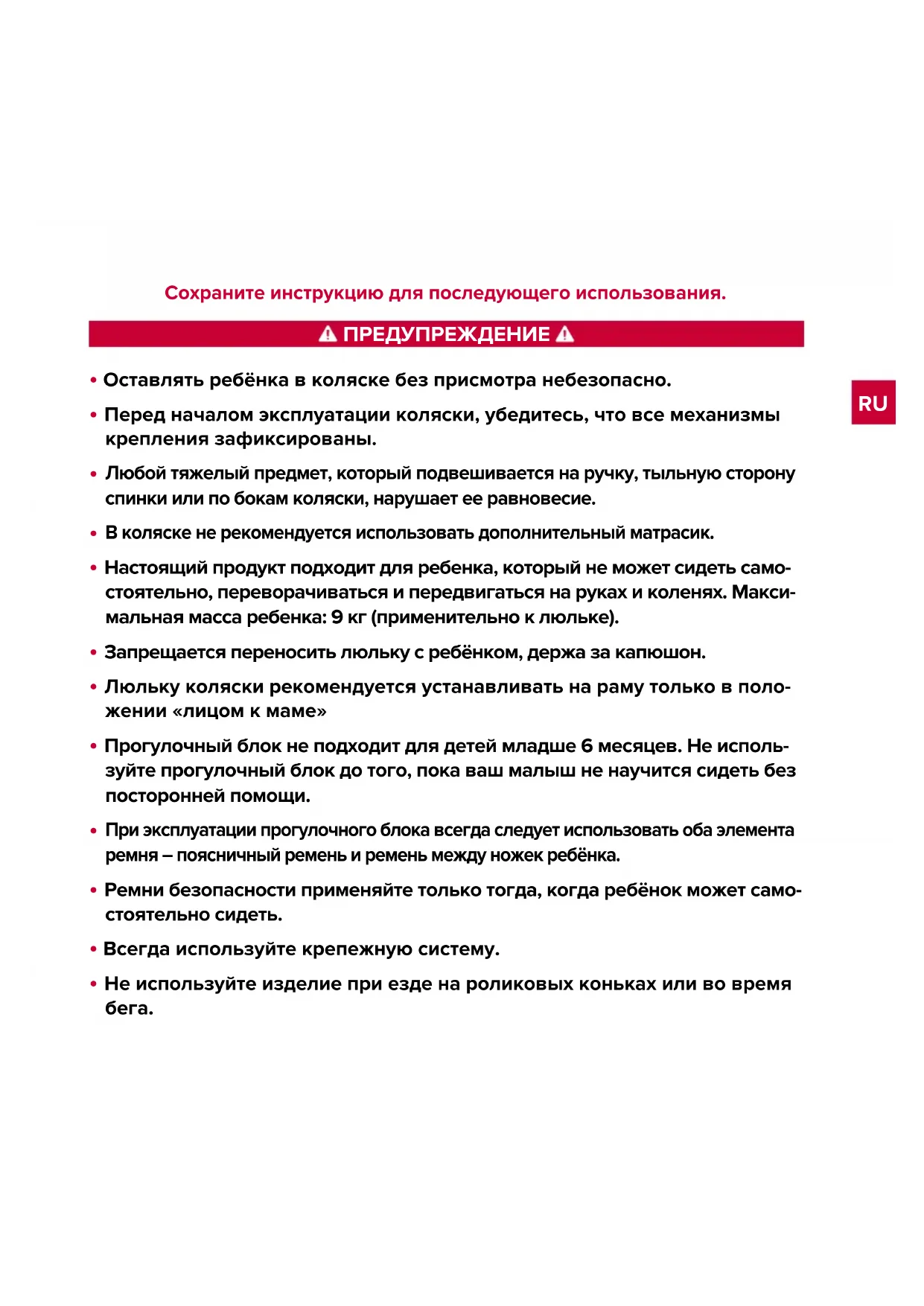 - Прогулочный блок не подходит для детей младше 6 месяцев. Не исполь- зуйте прогулочный блок до того, пока ваш малыш не научится сидеть без посторонней помощи.