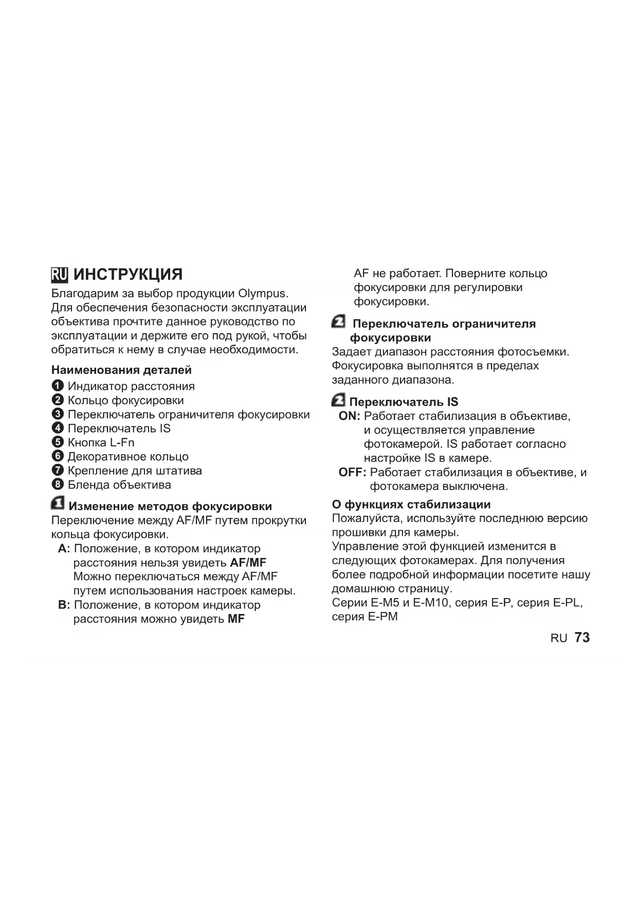 Благодарим за выбор продукции Olympus. Для обеспечения безопасности эксплуатации объектива прочтите данное руководство по эксплуатации и держите его под рукой, чтобы обратиться к нему в случае необходимости. Наименования деталей 1 Индикатор расстояния 2 Кольцо фокусировки 3 Переключатель ограничителя фокусировки 4 Переключатель IS 5 Кнопка L-Fn 6 Декоративное кольцо 7 Крепление для штатива 8 Бленда объектива Изменение методов фокусировки Переключение между AF/MF путем прокрутки кольца фокусировки. A: Положение, в котором индикатор расстояния нельзя увидеть AF/MF Можно переключаться между AF/MF путем использования настроек камеры. B: Положение, в котором индикатор расстояния можно увидеть MF AF не работает. Поверните кольцо фокусировки для регулировки фокусировки. Переключатель ограничителя фокусировки Задает диапазон расстояния фотосъемки. Фокусировка выполнятся в пределах заданного диапазона. Переключатель IS ON: Работает стабилизация в объективе, и осуществляется управление фотокамерой. IS работает согласно настройке IS в камере. OFF: Работает стабилизация в объективе, и фотокамера выключена. О функциях стабилизации Пожалуйста, используйте последнюю версию прошивки для камеры. Управление этой функцией изменится в следующих фотокамерах. Для получения более подробной информации посетите нашу домашнюю страницу. Серии E-M5 и E-M10, серия E-P , серия E-PL, серия E-PM RU74 RU Для установки объектива на цифровую фотокамеру стороннего производителя обратитесь к инструкциям для фотокамеры стороннего производителя. Кнопка L-Fn AF прекращает работу при нажатии кнопки. Удаление крепления для штатива и присоединение декоративного кольца Удаление крепления для штатива: Поверните регулятор крепления для штатива влево, чтобы ослабить крепление 1. Поверните крепление для штатива влево, совместите его с меткой 2 и снимите крепление для штатива с корпуса объектива 3. Установка декоративного кольца: Совместите метки и вставьте декоративное кольцо 1, за тем поверните его вправо до