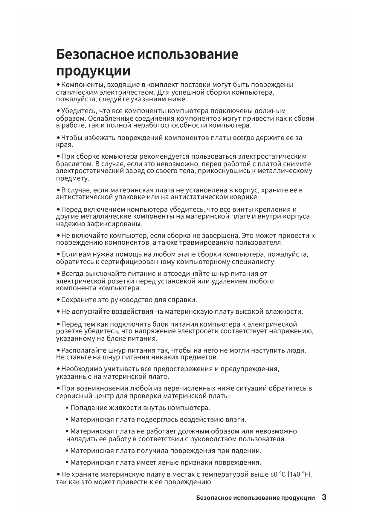 y В случае, если материнская плата не установлена в корпус, храните ее в антистатической упаковке или на антистатическом коврике. y Перед включением компьютера убедитесь, что все винты крепления и другие металлические компоненты на материнской плате и внутри корпуса надежно зафиксированы. y Не включайте компьютер, если сборка не завершена. Это может привести к повреждению компонентов, а также травмированию пользователя. y Если вам нужна помощь на любом этапе сборки компьютера, пожалуйста, обратитесь к сертифицированному компьютерному специалисту. y Всегда выключайте питание и отсоединяйте шнур питания от электрической розетки перед установкой или удалением любого компонента компьютера. y Сохраните это руководство для справки. y Не допускайте воздействия на материнскаую плату высокой влажности. y Перед тем как подключить блок питания компьютера к электрической