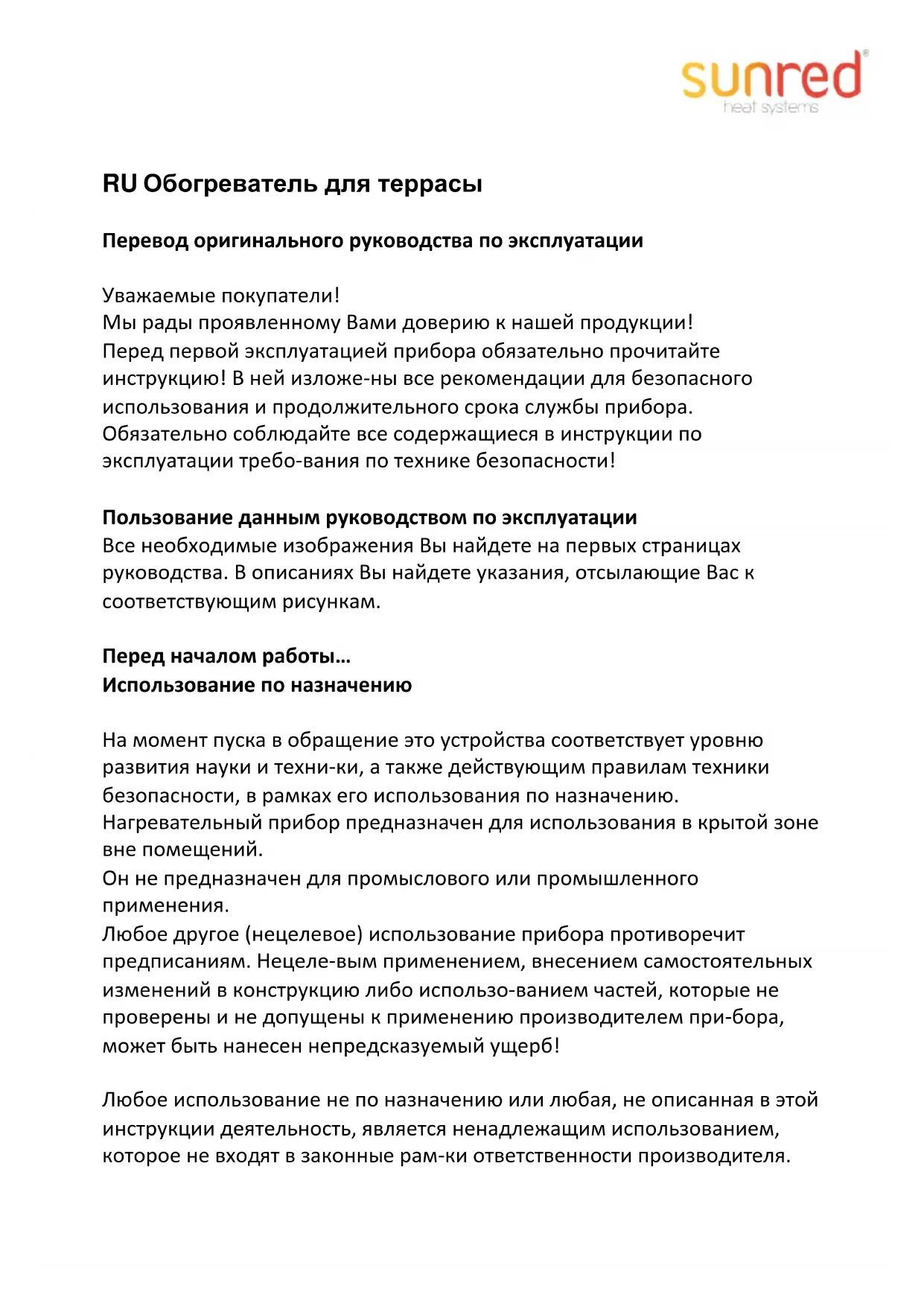 - Nu este voie să se îndepărteze sau să se acopere simbolurile lipite pe aparat. Instrucţiunile de pe aparat care nu se mai pot citi trebuie să se înlocuiască imediat. Curăţarea – Opriţi aparatul şi lăsaţi-l să se răcească complet. – Scoateţi ştecărul din priză. – Ştergeţi dispozitivul cu o lavetă uşor umedă. – Pentru curăţarea elemenţilor de încălzire şi a reflectorului, utilizaţi o pensulă cu perii lungi, moi. Îndepărtarea deşeurilor Îndepărtarea aparatului ca deşeu Nu este permis ca aparatele marcate cu simbolul alăturat să fie îndepărtate împreună cu deşeurile menajere. Sunteţi obligat să îndepărtaţi separat asemenea aparate electrice şi electronice uzate. Prin separarea deşeurilor dirijaţi aparatele uzate către reciclare sau către alte forme de revalorificare. În acest fel contribuiţi la evitarea ajungerii unor substanţe poluante în mediul înconjurător. Îndepărtarea ca deşeu a ambalajului Ambalajul este format din carton şi materiale plastice marcate corespunzător, care pot fi reciclate. – Dirijaţi aceste materiale către revalorificarea lor.RU Обогреватель для террасы Перевод оригинального руководства по эксплуатации Уважаемые покупатели! Мы рады проявленному Вами доверию к нашей продукции! Перед первой эксплуатацией прибора обязательно прочитайте инструкцию! В ней изложе-ны все рекомендации для безопасного использования и продолжительного срока службы прибора. Обязательно соблюдайте все содержащиеся в инструкции по эксплуатации требо-вания по технике безопасности! Пользование данным руководством по эксплуатации Все необходимые изображения Вы найдете на первых страницах руководства. В описаниях Вы найдете указания, отсылающие Вас к соответствующим рисункам. Перед началом работы… Использование по назначению На момент пуска в обращение это устройства соответствует уровню развития науки и техни-ки, а также действующим правилам техники безопасности, в рамках его использования по назначению. Нагревательный прибор предназначен для использования в крытой зоне вне помещений. Он не предназначен для промыслового или промышленного применения. Любое другое (нецелевое) использование прибора противоречит предписаниям. Нецеле-вым применением, внесением самостоятельных изменений в конструкцию либо использо-ванием частей, которые не проверены и не допущены к применению производителем при-бора, может быть нанесен непредсказуемый ущерб! Любое использование не по назначению или любая, не описанная в этой инструкции деятельность, является ненадлежащим использованием, которое не входят в законные рам-ки ответственности производителя.Для Вашей безопасности Общие указания по безопасности