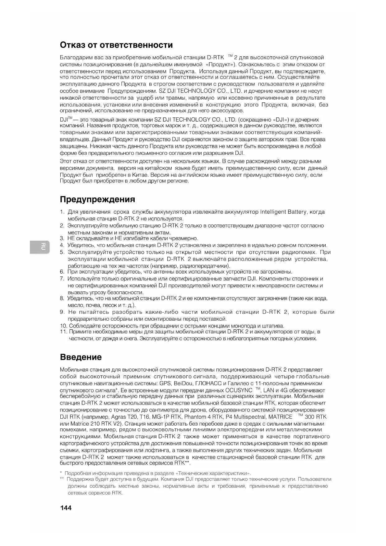 2 для высокоточной спутниковой системы позиционирования (в дальнейшем именуемой «Продукт»). Ознакомьтесь с этим отказом от ответственности перед использованием Продукта. Используя данный Продукт, вы подтверждаете, что полностью прочитали этот отказ от ответственности и соглашаетесь с ним. Осуществляйте эксплуатацию данного Продукта в строгом соответствии с руководством пользователя и уделяйте особое внимание Предупреждениям. SZ DJI TECHNOLOGY CO., LTD. и дочерние компании не несут никакой ответственности за ущерб или травмы, напрямую или косвенно причиненные в результате использования, установки или внесения изменений в конструкцию этого Продукта, включая, без ограничений, использование не предназначенных для него аксессуаров. DJI