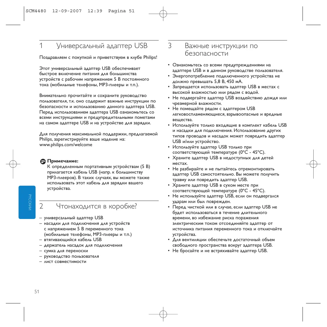 12-09-2007 12:39 Pagina 51 Универсальный адаптер USB Поздравляем с покупкой и приветствуем в клубе Philips! Этот универсальный адаптер USB обеспечивает быстрое включение питания для большинства устройств с рабочим напряжением 5 В постоянного тока (мобильные телефоны, MP3-плееры и т.п.). Внимательно прочитайте и сохраните руководство пользователя, т.к. оно содержит важные инструкции по безопасности и использованию данного адаптера USB. Перед использованием адаптера USB ознакомьтесь со всеми инструкциями и предупредительными пометами на самом адаптере USB и на устройстве для зарядки. Для получения максимальной поддержки, предлагаемой Philips, зарегистрируйте ваше изделие на: www.philips.com/welcome Примечание: К определенным портативным устройствам (5 В) прилагается кабель USB (напр. к большинству MP3-плееров). В таких случаях, вы можете также использовать этот кабель для зарядки вашего устройства. РYССКИИ