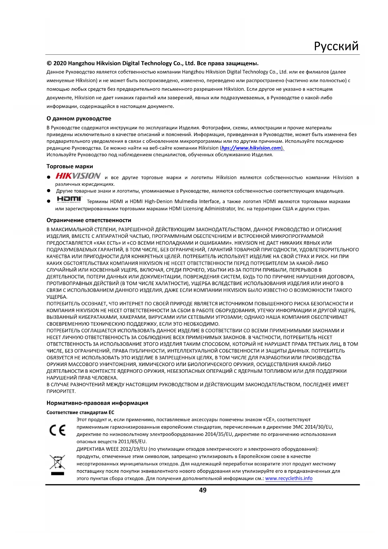 © 2020 Hangzhou Hikvision Digital Technology Co., Ltd. Все права защищены. Данное Руководство является собственностью компании Hangzhou Hikvision Digital Technology Co., Ltd. или ее филиалов (далее именуемые Hikvision) и не может быть воспроизведено, изменено, переведено или распространено (частично или полностью) с помощью любых средств без предварительного письменного разрешения Hikvision. Если другое не указано в настоящем документе, Hikvision не дает никаких гарантий или заверений, явных или подразумеваемых, в Руководстве о какой-либо информации, содержащейся в настоящем документе. О данном руководстве В Руководстве содержатся инструкции по эксплуатации Изделия. Фотографии, схемы, иллюстрации и прочие материалы приведены исключительно в качестве описаний и пояснений. Информация, приведенная в Руководстве, может быть изменена без предварительного уведомления в связи с обновлением микропрограммы или по другим причинам. Используйте последнюю редакцию Руководства. Ее можно найти на веб-сайте компании Hikvision (https://www.hikvision.com). Используйте Руководство под наблюдением специалистов, обученных обслуживанию Изделия. Торговые марки и все другие торговые марки и логотипы Hikvision являются собственностью компании Hikvision в различных юрисдикциях. Другие товарные знаки и логотипы, упоминаемые в Руководстве, являются собственностью соответствующих владельцев. Термины HDMI и HDMI High-Definition Multimedia Interface, а также логотип HDMI являются торговыми марками или зарегистрированными торговыми марками HDMI Licensing Administrator, Inc. на территории США и других стран. Ограничение ответственности В МАКСИМАЛЬНОЙ СТЕПЕНИ, РАЗРЕШЕННОЙ ДЕЙСТВУЮЩИМ ЗАКОНОДАТЕЛЬСТВОМ, ДАННОЕ РУКОВОДСТВО И ОПИСАНИЕ ИЗДЕЛИЯ, ВМЕСТЕ С АППАРАТНОЙ ЧАСТЬЮ, ПРОГРАММНЫМ ОБЕСПЕЧЕНИЕМ И ВСТРОЕННОЙ МИКРОПРОГРАММОЙ ПРЕДОСТАВЛЯЕТСЯ «КАК ЕСТЬ» И «СО ВСЕМИ НЕПОЛАДКАМИ И ОШИБКАМИ». HIKVISION НЕ ДАЕТ НИКАКИХ ЯВНЫХ ИЛИ ПОДРАЗУМЕВАЕМЫХ ГАРАНТИЙ, В ТОМ ЧИСЛЕ, БЕЗ ОГРАНИЧЕНИЙ, ГАРАНТИЙ ТОВАРНОЙ ПРИГОДНОСТИ, УДОВЛЕТВОРИТЕЛЬНОГО КАЧЕСТВА ИЛИ ПРИГОДНОСТИ ДЛЯ КОНКРЕТНЫХ ЦЕЛЕЙ. ПОТРЕБИТЕЛЬ ИСПОЛЬЗУЕТ ИЗДЕЛИЕ НА СВОЙ СТРАХ И РИСК. НИ ПРИ КАКИХ ОБСТОЯТЕЛЬСТВАХ КОМПАНИЯ HIKVISION НЕ НЕСЕТ ОТВЕТСТВЕННОСТИ ПЕРЕД ПОТРЕБИТЕЛЕМ ЗА КАКОЙ-ЛИБО СЛУЧАЙНЫЙ ИЛИ КОСВЕННЫЙ УЩЕРБ, ВКЛЮЧАЯ, СРЕДИ ПРОЧЕГО, УБЫТКИ ИЗ-ЗА ПОТЕРИ ПРИБЫЛИ, ПЕРЕРЫВОВ В ДЕЯТЕЛЬНОСТИ, ПОТЕРИ ДАННЫХ ИЛИ ДОКУМЕНТАЦИИ, ПОВРЕЖДЕНИЯ СИСТЕМ, БУДЬ ТО ПО ПРИЧИНЕ НАРУШЕНИЯ ДОГОВОРА, ПРОТИВОПРАВНЫХ ДЕЙСТВИЙ (В ТОМ ЧИСЛЕ ХАЛАТНОСТИ), УЩЕРБА ВСЛЕДСТВИЕ ИСПОЛЬЗОВАНИЯ ИЗДЕЛИЯ ИЛИ ИНОГО В СВЯЗИ С ИСПОЛЬЗОВАНИЕМ ДАННОГО ИЗДЕЛИЯ, ДАЖЕ ЕСЛИ КОМПАНИИ HIKVISION БЫЛО ИЗВЕСТНО О ВОЗМОЖНОСТИ ТАКОГО УЩЕРБА. ПОТРЕБИТЕЛЬ ОСОЗНАЕТ, ЧТО ИНТЕРНЕТ ПО СВОЕЙ ПРИРОДЕ ЯВЛЯЕТСЯ ИСТОЧНИКОМ ПОВЫШЕННОГО РИСКА БЕЗОПАСНОСТИ И КОМПАНИЯ HIKVISION НЕ НЕСЕТ ОТВЕТСТВЕННОСТИ ЗА СБОИ В РАБОТЕ ОБОРУДОВАНИЯ, УТЕЧКУ ИНФОРМАЦИИ И ДРУГОЙ УЩЕРБ, ВЫЗВАННЫЙ КИБЕРАТАКАМИ, ХАКЕРАМИ, ВИРУСАМИ ИЛИ СЕТЕВЫМИ УГРОЗАМИ; ОДНАКО НАША КОМПАНИЯ ОБЕСПЕЧИВАЕТ СВОЕВРЕМЕННУЮ ТЕХНИЧЕСКУЮ ПОДДЕРЖКУ, ЕСЛИ ЭТО НЕОБХОДИМО. ПОТРЕБИТЕЛЬ СОГЛАШАЕТСЯ ИСПОЛЬЗОВАТЬ ДАННОЕ ИЗДЕЛИЕ В СООТВЕТСТВИИ СО ВСЕМИ ПРИМЕНИМЫМИ ЗАКОНАМИ И НЕСЕТ ЛИЧНУЮ ОТВЕТСТВЕННОСТЬ ЗА СОБЛЮДЕНИЕ ВСЕХ ПРИМЕНИМЫХ ЗАКОНОВ. В ЧАСТНОСТИ, ПОТРЕБИТЕЛЬ НЕСЕТ ОТВЕТСТВЕННОСТЬ ЗА ИСПОЛЬЗОВАНИЕ ЭТОГО ИЗДЕЛИЯ ТАКИМ СПОСОБОМ, КОТОРЫЙ НЕ НАРУШАЕТ ПРАВА ТРЕТЬИХ ЛИЦ, В ТОМ ЧИСЛЕ, БЕЗ ОГРАНИЧЕНИЙ, ПРАВА ПУБЛИЧНОСТИ, ИНТЕЛЛЕКТУАЛЬНО