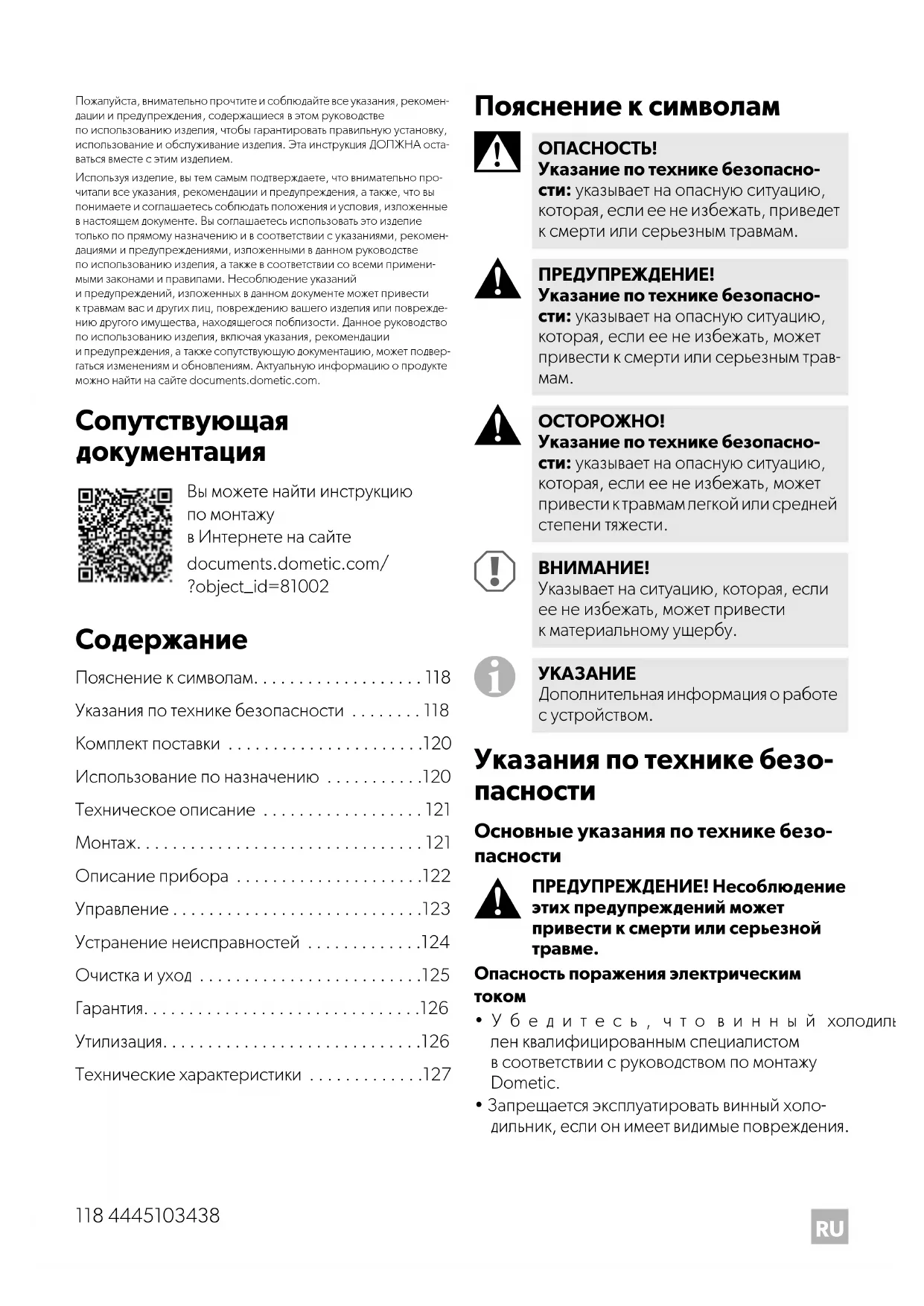 Пожалуйста, внимательно прочтите и соблюдайте все указания, рекомен- дации и предупреждения, содержащиеся в этом руководстве по использованию изделия, чтобы гарантировать правильную установку, использование и обслуживание изделия. Эта инструкция ДОЛЖНА оста-ваться вместе с этим изделием.Используя изделие, вы тем самым подтверждаете, что внимательно про- читали все указания, рекомендации и предупреждения, а также, что вы понимаете и соглашаетесь соблюдать положения и условия, изложенные в настоящем документе. Вы соглашаетесь использовать это изделие только по прямому назначению и в соответствии с указаниями, рекомен- дациями и предупреждениями, изложенными в данном руководстве по использованию изделия, а также в соответствии со всеми примени- мыми законами и правилами. Несоблюдение указаний и предупреждений, изложенных в данном документе может привести к травмам вас и других лиц, повреждению вашего изделия или поврежде- нию другого имущества, находящегося поблизости. Данное руководство по использованию изделия, включая указания, рекомендации и предупреждения, а также сопутствующую документацию, может подвер- гаться изменениям и обновлениям. Актуальную информацию о продукте можно найти на сайте documents.dometic.com. Сопутствующая документация