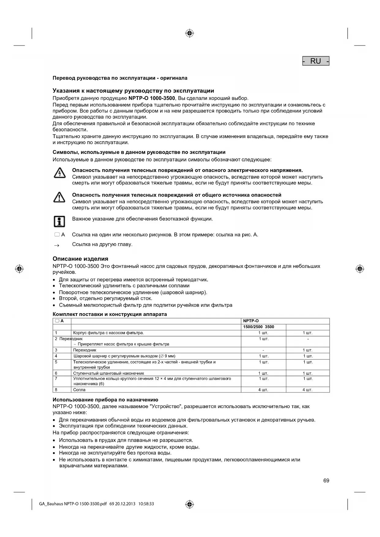 GA_Bauhaus NPTP-O 1500-3500.pdf 68 20.12.2013 10:58:3369 - RU - Перевод руководства по эксплуатации - оригинала Указания к настоящему руководству по эксплуатации Приобретя данную продукцию NPTP-O 1000-3500, Вы сделали хороший выбор. Перед первым использованием прибора тщательно прочитайте инструкцию по эксплуатации и ознакомьтесь с прибором. Все работы с данным прибором и на нем разрешается проводить только при соблюдении условий данного руководства по эксплуатации. Для обеспечения правильной и безопасной эксплуатации обязательно соблюдайте инструкции по технике безопасности