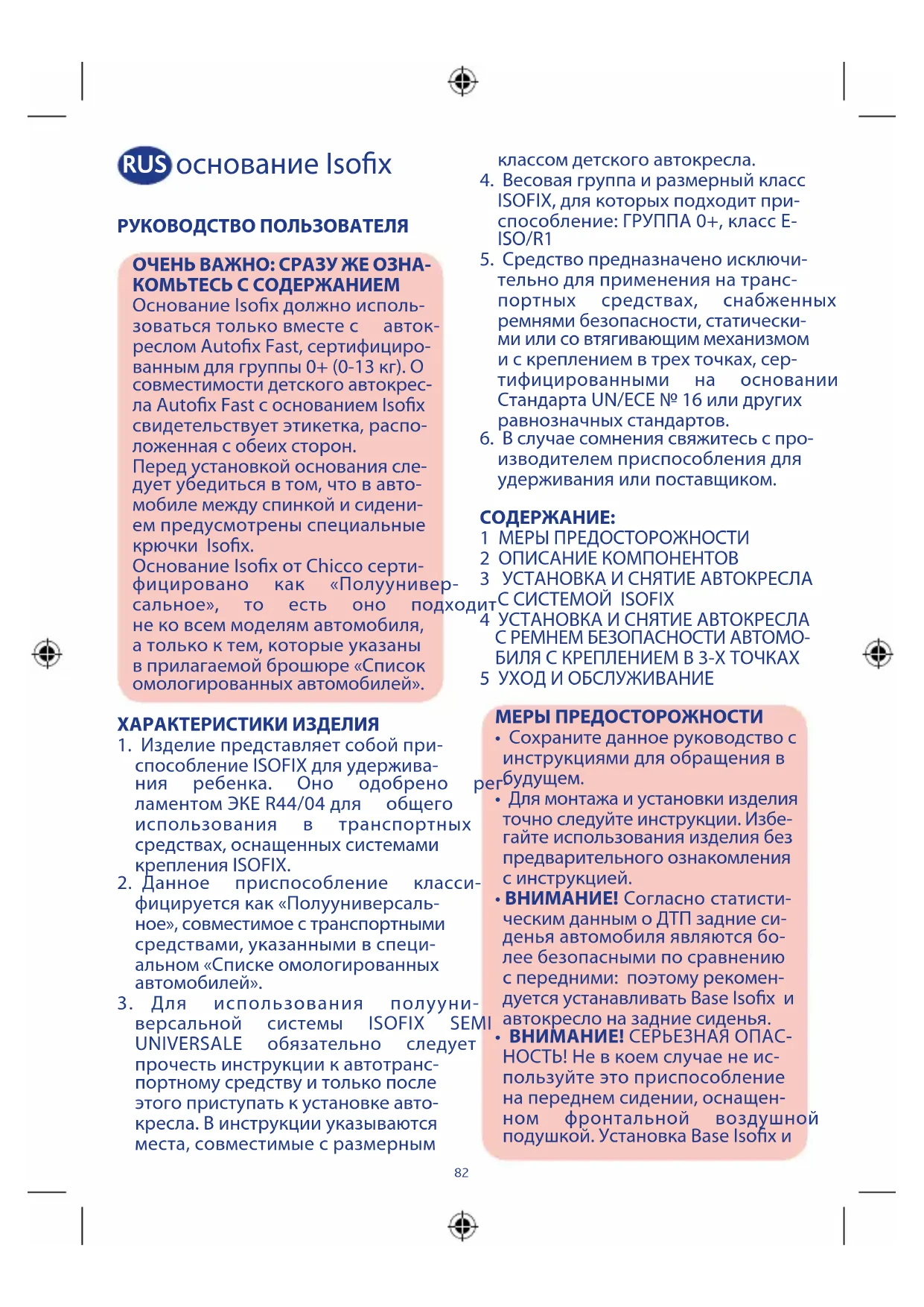 - ВНИМАНИЕ!СЕРЬЕЗНАЯОПАС- НОСТЬ!Невкоемслучаенеис- пользуйтеэтоприспособление напереднемсидении,оснащен- ном фронтальной воздушной подушкой.УстановкаBaseIsoxи основаниеIsox РУКОВОДСТВО ПОЛЬЗОВАТЕЛЯ ОЧЕНЬ ВАЖНО: СРАЗУ ЖЕ ОЗНА- КОМЬТЕСЬ С СОДЕРЖАНИЕМ ОснованиеIsoxдолжноисполь- зоватьсятольковместес авток- ресломAutoxFast,сертифициро- ваннымдлягруппы0+(0-13кг).О совместимостидетскогоавтокрес- лаAutoxFastсоснованиемIsox свидетельствуетэтикетка,распо- ложеннаясобеихсторон. Передустановкойоснованиясле- дуетубедитьсявтом,чтовавто- мобилемеждуспинкойисидени- емпредусмотреныспециальные крючкиIsox. ОснованиеIsoxотChiccoсерти- фицировано как «Полуунивер- сальное», то есть оно подходит нековсеммоделямавтомобиля, атолькоктем,которыеуказаны вприлагаемойброшюре«Список омологированныхавтомобилей». ХАРАКТЕРИСТИКИ ИЗДЕЛИЯ 1.Изделиепредставляетсобойпри- способлениеISOFIXдляудержива- ния ребенка. Оно одобрено рег- ламентомЭКЕR44/04для общего использования в транспортных средствах,оснащенныхсистемами крепленияISOFIX. 2.Данное приспособление класси- фицируетсякак«Полууниверсаль- ное»,совместимоестранспортными средствами,указаннымивспеци- альном«Спискеомологированных автомобилей». 3.Для использования полууни- версальной системы ISOFIX SEMI UNIVERSALE обязательно следует прочестьинструкциикавтотранс- портномусредствуитолькопосле этогоприступатькустановкеавто- кресла.Винструкцииуказываются места,совместимыесразмерным82