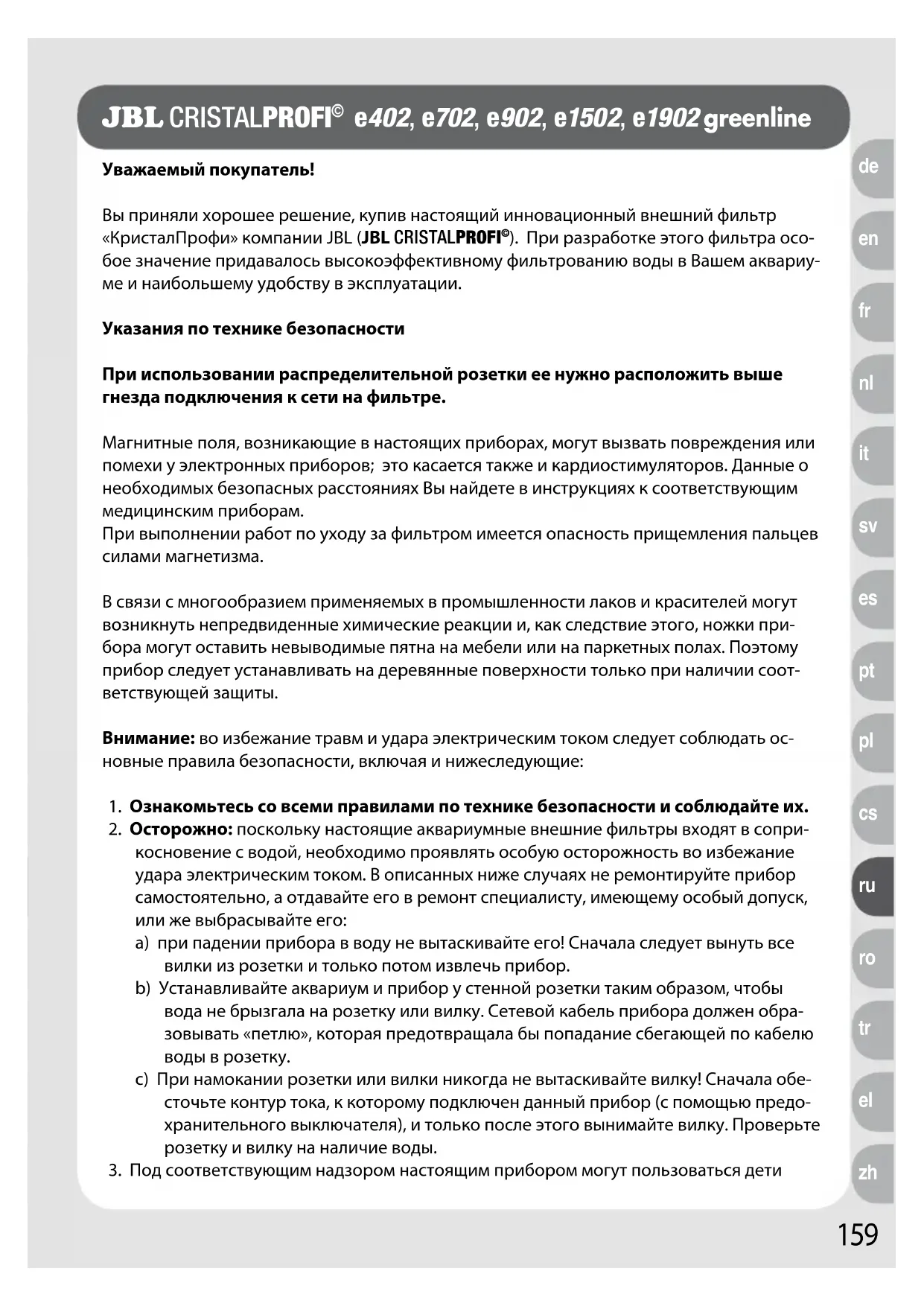 ). При разработке этого фильтра осо-бое значение придавалось высокоэффективному фильтрованию воды в Вашем аквариу-ме и наибольшему удобству в эксплуатации.Указания по технике безопасности При использовании распределительной розетки ее нужно расположить выше гнезда подключения к сети на фильтре.Магнитные поля, возникающие в настоящих приборах, могут вызвать повреждения или помехи у электронных приборов; это касается также и кардиостимуляторов. Данные о необходимых безопасных расстояниях Вы найдете в инструкциях к соответствующим медицинским приборам.При выполнении работ по уходу за фильтром имеется опасность прищемления пальцев силами магнетизма.В связи с многообразием применяемых в промышленности лаков и красителей могут возникнуть непредвиденные химические реакции и, как следствие этого, ножки при-бора могут оставить невыводимые пятна на мебели или на паркетных полах. Поэтому прибор следует устанавливать на деревянные поверхности только при наличии соот-ветствующей защиты.Внимание: во избежание травм и удара электрическим током следует соблюдать ос-новные правила безопасности, включая и нижеследующие:1. Ознакомьтесь со всеми правилами по технике безопасности и соблюдайте их.2. Осторожно: поскольку настоящие аквариумные внешние фильтры входят в сопри-косновение с водой, необходимо проявлять особую осторожность во избежание удара электрическим током. В описанных ниже случаях не ремонтируйте прибор самостоятельно, а отдавайте его в ремонт специалисту, имеющему особый допуск, или же выбрасывайте его:a) при падении прибора в воду не вытаскивайте его! Сначала следует вынуть все вилки из розетки и только потом извлечь прибор. b) Устанавливайте аквариум и прибор у стенной розетки таким образом, чтобы вода не брызгала на розетку или вилку. Сетевой кабель прибора должен обра-зовывать «петлю», которая предотвращала бы попадание сбегающей по кабелю воды в розетку. c) При намокании розетки или вилки никогда не вытаскивайте вилку! Сначала обе-сточьте контур тока, к которому подключен данный прибор (с помощью предо-хранительного выключателя), и только после этого вынимайте вилку. Проверьте розетку и вилку на наличие воды.3. Под соответствующим надзором настоящим прибором могут пользоваться дети JBL CRISTALPROFI