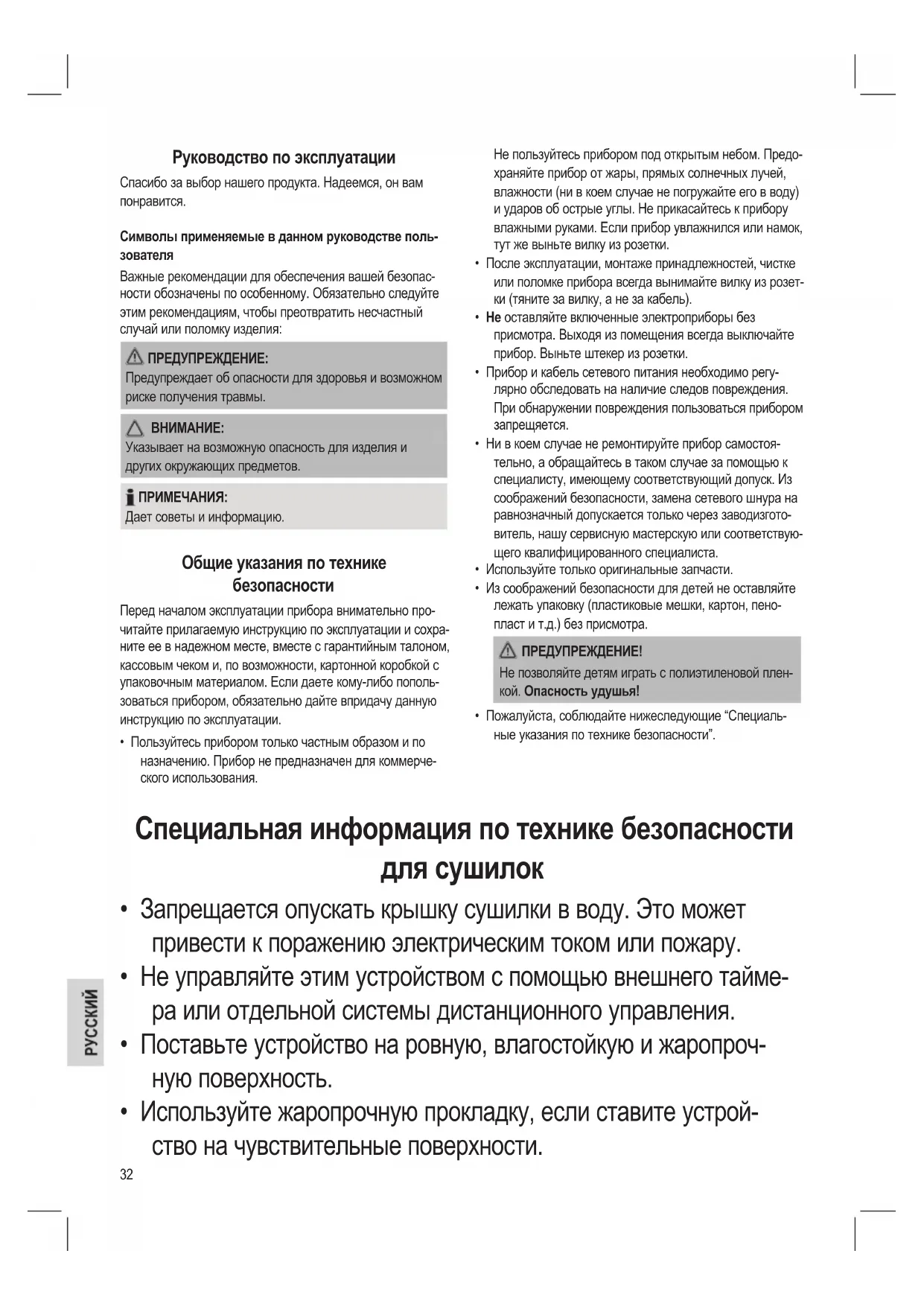- Пожалуйста, соблюдайте нижеследующие “Специаль- ные указания по технике безопасности”. Специальная информация по технике безопасности для сушилок