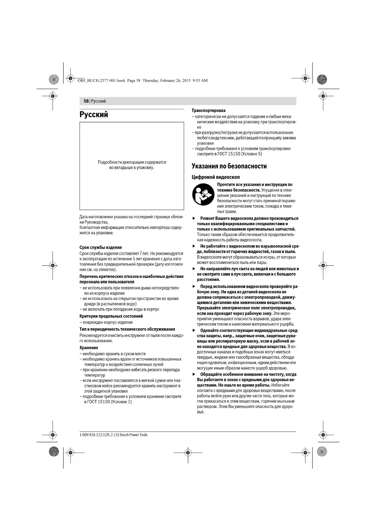 Подробности декларации содержатся во вкладыше в упаковку. Дата изготовления указана на последней странице облож- ки Руководства. Контактная информация относительно импортера содер- жится на упаковке. OBJ_BUCH-2377-001.book Page 58 Thursday, February 26, 2015 9:55 AMРусский | 59 Bosch Power Tools 1 609 92A 122 | (26.2.15) Не стойте в воде, если Вы пользуетесь видеоско- пом. При работах в воде возникает риск поражения электрическим током.