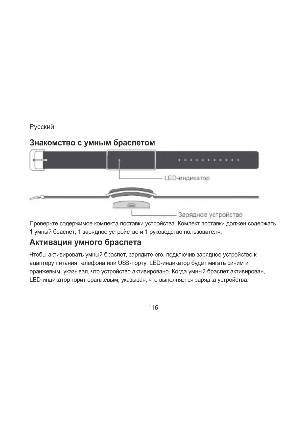 Знакомство с умным браслетом Проверьте содержимое комлекта поставки устройства. Комлект поставки должен содержать 1 умный браслет, 1 зарядное устройство и 1 руководство пользователя. Активация умного браслета Чтобы активировать умный браслет, зарядите его, подключив зарядное устройство к адаптеру питания телефона или USB-порту. LED-индикатор будет мигать синим и оранжевым, указывая, что устройство активировано. Когда умный браслет активирован, LED-индикатор горит оранжевым, указывая, что выполняется зарядка устройства.Русский