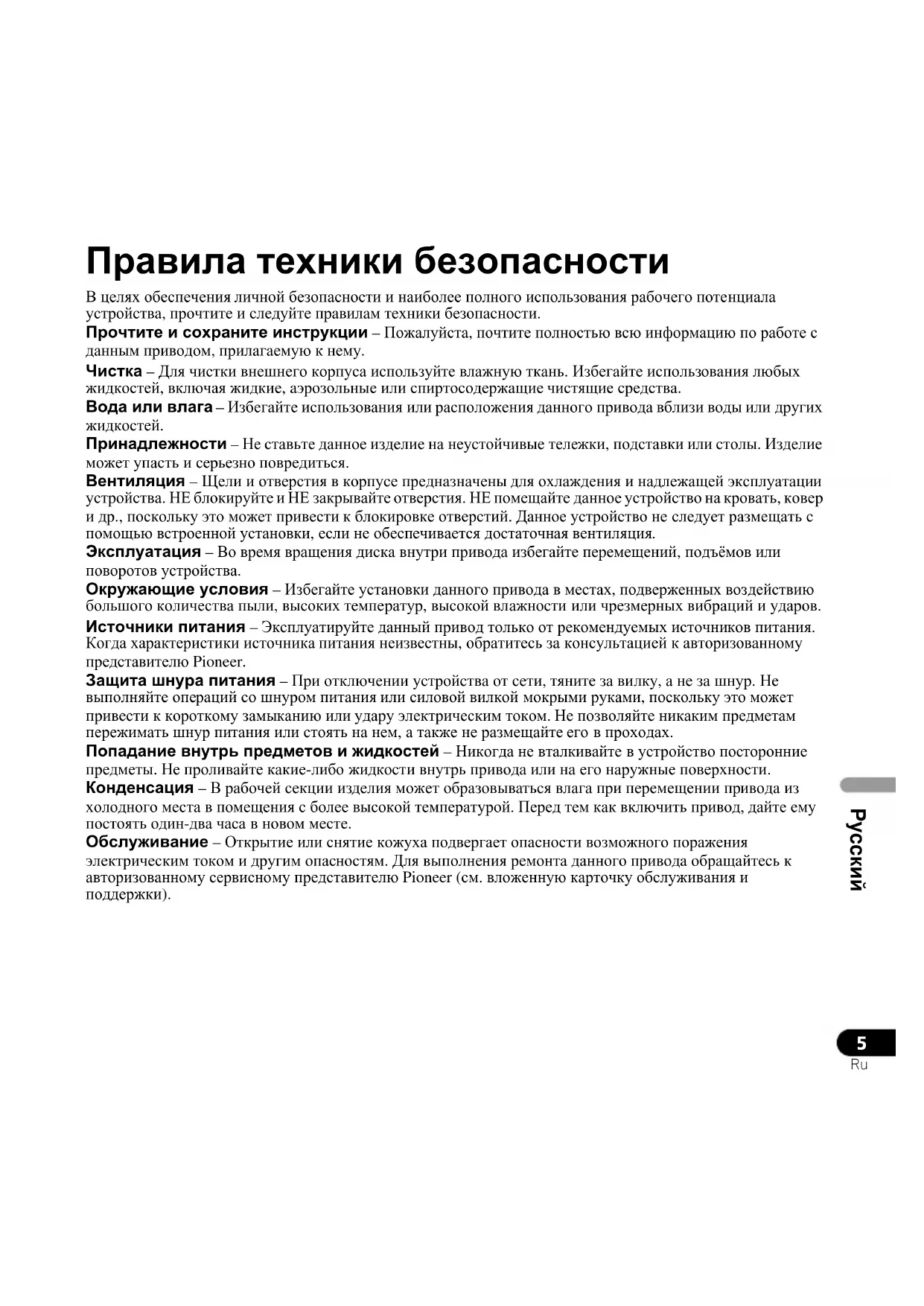 Принадлежности – Не ставьте данное изделие на неустойчивые тележки, подставки или столы. Изделие может упасть и серьезно повредиться. Вентиляция – Щели и отверстия в корпусе предназначены для охлаждения и надлежащей эксплуатации устройства. НЕ блокируйте и НЕ закрывайте отверстия. НЕ помещайте данное устройство на кровать, ковер и др., поскольку это может привести к блокировке отверстий. Данное устройство не следует размещать с помощью встроенной установки, если не обеспечивается достаточная вентиляция. Эксплуатация – Во время вращения диска внутри привода избегайте перемещений, подъёмов или поворотов устройства. Окружающие условия – Избегайте установки данного привода в местах, подверженных воздействию большого количества пыли, высоких температур, высокой влажности или чрезмерных вибраций и ударов. Источники питания – Эксплуатируйте данный привод только от рекомендуемых источников питания. Когда характеристики источника питания неизвестны, обратитесь за консультацией к авторизованному представителю Pioneer. Защита шнура питания – При отключении устройства от сети, тяните за вилку, а не за шнур. Не выполняйте операций со шнуром питания или силовой вилкой мокрыми руками, поскольку это может привести к короткому замыканию или удару электрическим током. Не позволяйте никаким предметам пережимать шнур питания или стоять на нем, а также не размещайте его в проходах. Попадание внутрь предметов и жидкостей – Никогда не вталкивайте в устройство посторонние предметы. Не проливайте какие-либо жидкости внутрь привода или на его наружные поверхности. Конденсация – В рабочей секции изделия может образовываться влага при перемещении привода из холодного места в помещения с более высокой температурой. Перед тем как включить привод, дайте ему постоять один-два часа в новом месте. Обслуживание – Открытие или снятие кожуха подвергает опасности возможного поражения электрическим током и другим опасностям. Для выполнения ремонта данного привода обращайтесь к авторизованному сервисному представителю Pioneer (см. вложенную карточку обслуживания и поддержки). BDR-XD05T_Ru.fm 5 ページ 2013年4月9日 火曜日 午後12時5分6
