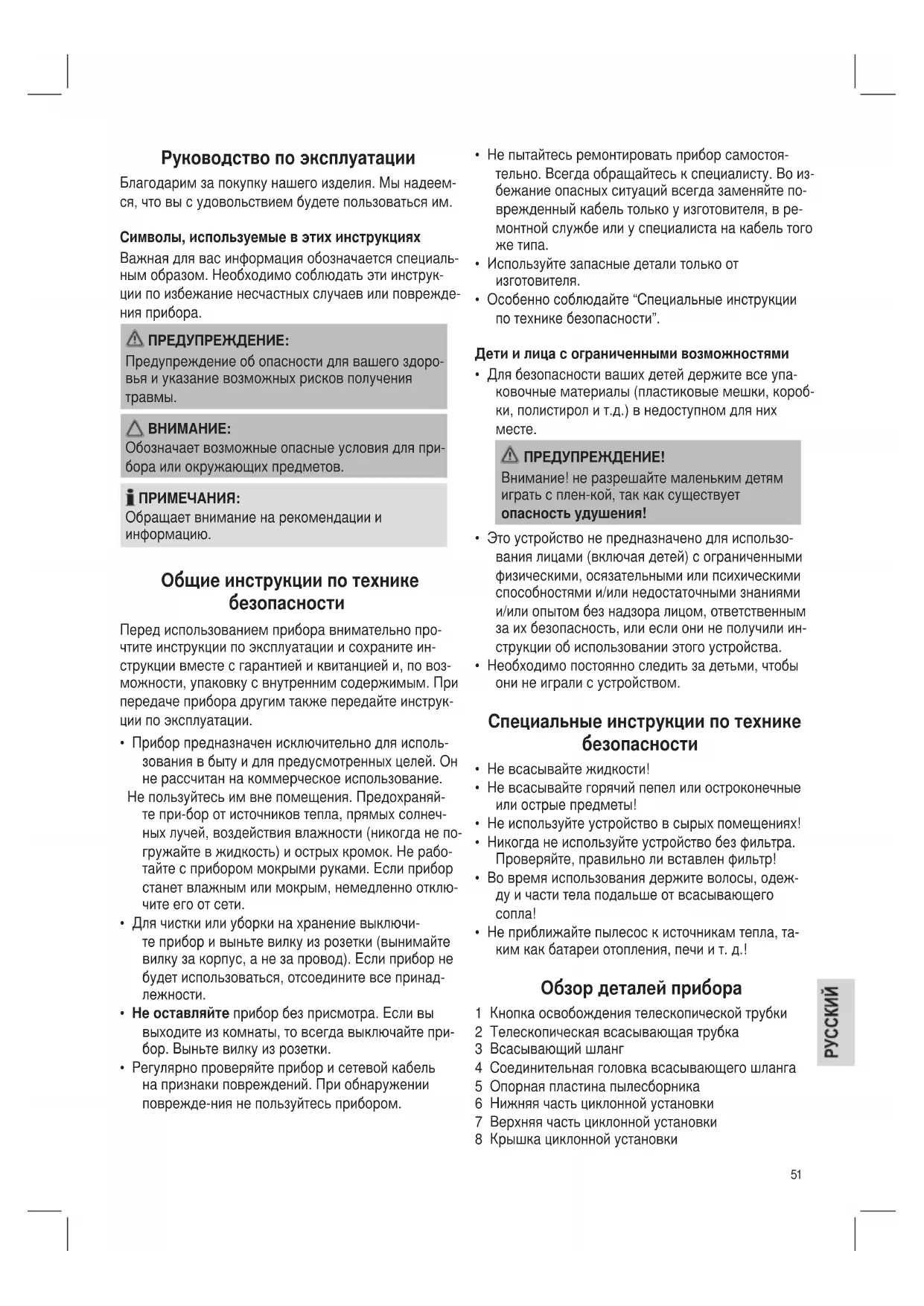 - Не приближайте пылесос к источникам тепла, та- ким как батареи отопления, печи и т. д.! Обзор деталей прибора 1 Кнопка освобождения телескопической трубки 2 Телескопическая всасывающая трубка 3 Всасывающий шланг 4 Соединительная головка всасывающего шланга 5 Опорная пластина пылесборника 6 Нижняя часть циклонной установки 7 Верхняя часть циклонной установки 8 Крышка циклонной установки Руководство по эксплуатации Благодарим за покупку нашего изделия. Мы надеем- ся, что вы с удовольствием будете пользоваться им. Символы, используемые в этих инструкциях Важная для вас информация обозначается специаль- ным образом. Необходимо соблюдать эти инструк- ции по избежание несчастных случаев или поврежде- ния прибора. ПРЕДУПРЕЖДЕНИЕ: Предупреждение об опасности для вашего здоро- вья и указание возможных рисков получения