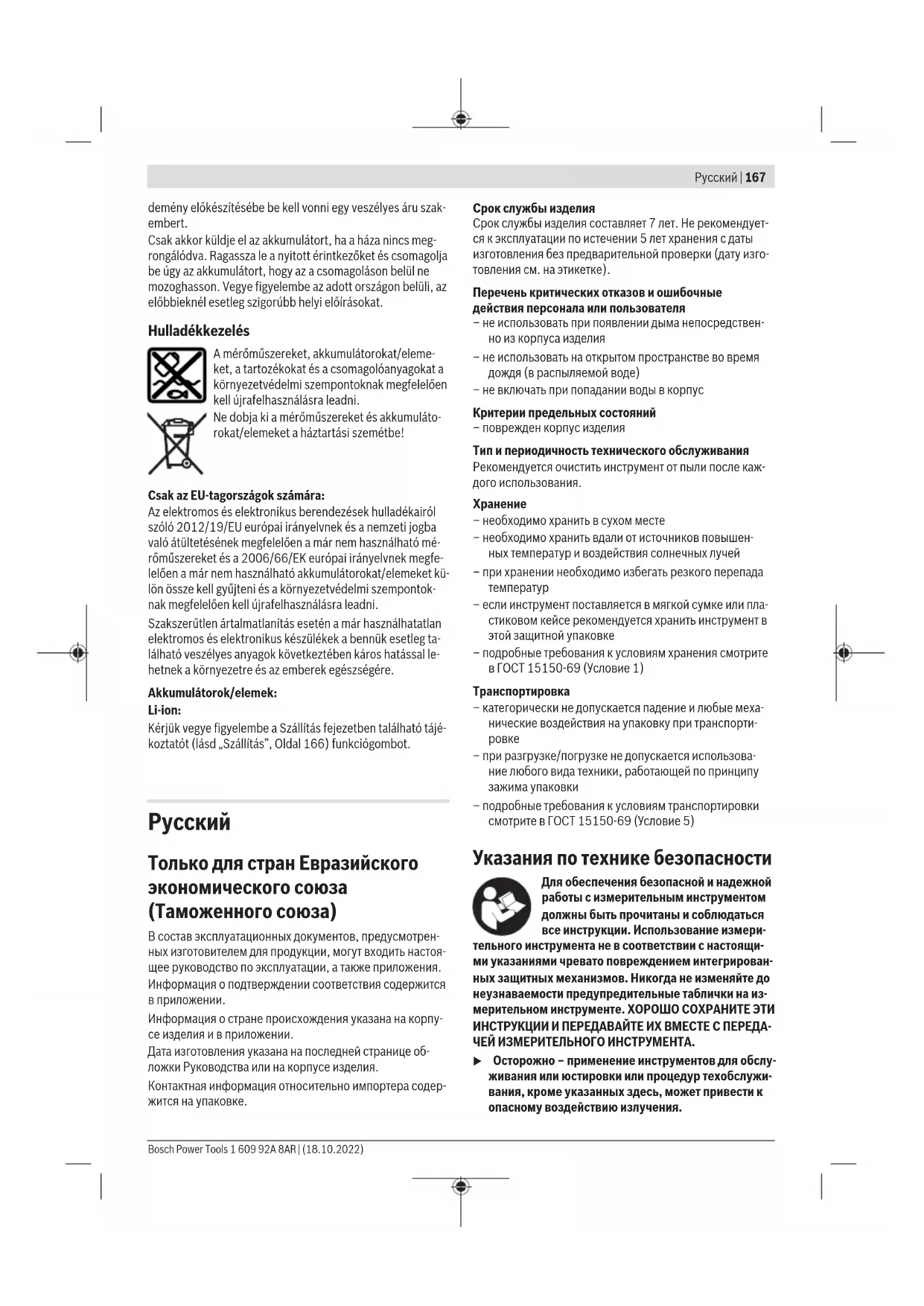 – при разгрузке/погрузке не допускается использова- ние любого вида техники, работающей по принципу зажима упаковки – подробные требования к условиям транспортировки смотрите в ГОСТ 15150-69 (Условие 5) Указания по технике безопасности Для обеспечения безопасной и надежной работы с измерительным инструментом должны быть прочитаны и соблюдаться все инструкции. Использование измери- тельного инструмента не в соответствии с настоящи- ми указаниями чревато повреждением интегрирован- ных защитных механизмов. Никогда не изменяйте до неузнаваемости предупредительные таблички на из- мерительном инструменте. ХОРОШО СОХРАНИТЕ ЭТИ ИНСТРУКЦИИ И ПЕРЕДАВАЙТЕ ИХ ВМЕСТЕ С ПЕРЕДА- ЧЕЙ ИЗМЕРИТЕЛЬНОГО ИНСТРУМЕНТА. u Осторожно – применение инструментов для обслу- живания или юстировки или процедур техобслужи- вания, кроме указанных здесь, может привести к опасному воздействию излучения. Bosch Power Tools 1 609 92A 8AR | (18.10.2022)168 | Русский u Измерительный инструмент поставляется с преду- предительной табличкой лазерного излучения (по- казана на странице с изображением измерительно- го инструмента). u Если текст предупредительной таблички лазерного излучения не на Вашем родном языке, перед пер- вым запуском в эксплуатацию заклейте ее наклей- кой на Вашем родном языке, которая входит в объем поставки. Не направляйте луч лазера на людей или животных и сами не смотрите на прямой или отражаемый луч лазера. Этот луч мо- жет слепить людей, стать причиной не- счастного случая или повредить глаза. u В случае попадания лазерного луча в глаз глаза нужно намеренно закрыть и немедленно отвер- нуться от луча. u Не меняйте ничего в лазерном устройстве. u Не используйте очки для работы с лазерным инструментом (принадлежность) в качестве защит- ных очков. Очки для работы с лазерным инструмен- том обеспечивают лучшее распознавание лазерного луча, но не защищают от лазерного излучения. u Не используйте очки для работы с лазерным инструментом (принадлежность) в качестве солн- цезащитных очков или за рулем. Очки для работы с лазером не обеспечивают защиту от УФ-излучения и мешают правильному цветовосприятию. u Ремонт измерительного инструмента разрешается выполнять только квалифицированному персоналу и только с использованием оригинальных запча- стей. Этим обеспечивается безопасность измеритель- ного инструмента. u Не позволяйте детям пользоваться лазерным из- мерительным инструментом без присмотра. Дети могут по неосторожности ослепить себя или посто- ронних людей. u Не работайте с измерительным инструментом во взрывоопасной среде, поблизости от горючих жид- костей, газов и пыли. В измерительном инструменте могут образоваться искры, от которых может воспла- мениться пыль или пары. u Не вскрывайте аккумулятор. При этом возникает опасность короткого замыкания. u При повреждении и ненадлежащем использовании аккумулятора может выделиться газ. Аккумулятор может возгораться или взрываться.Обеспечьте при- ток свежего воздуха и при возникновении жалоб обра- титесь к врачу. Газы могут вызвать раздражение дыха- тельных путей. u При неправильном использовании из аккумулятора может потечь жидкость. Избегайте соприкоснове- ния с ней. При случайном контакте промойте соот- ветствующее место водой. Если эта жидкость попа- дет в глаза, то дополнительно обратитесь за помощью к врачу. Выт